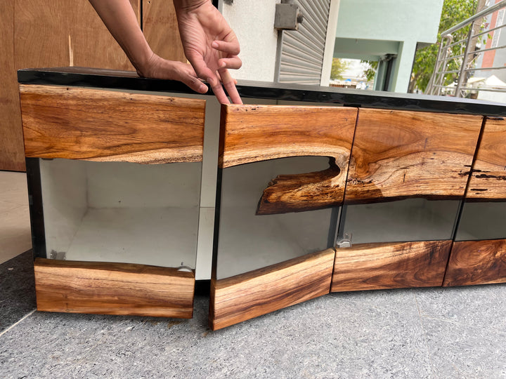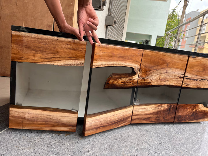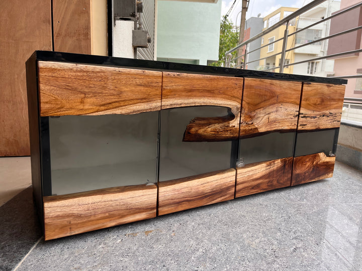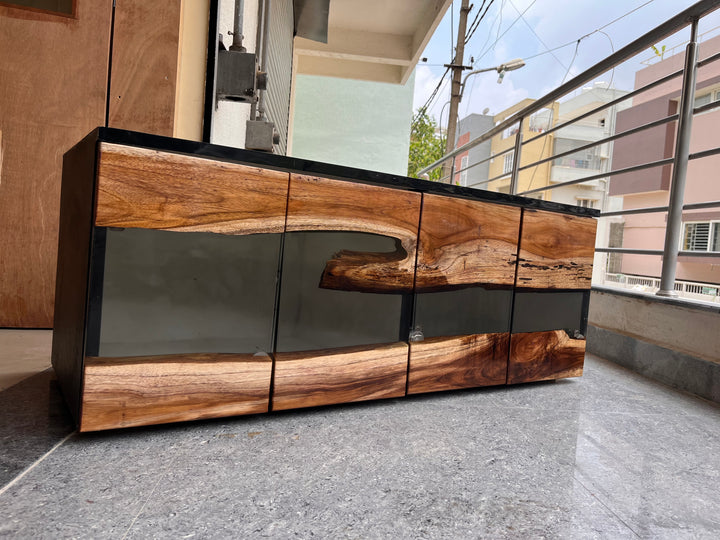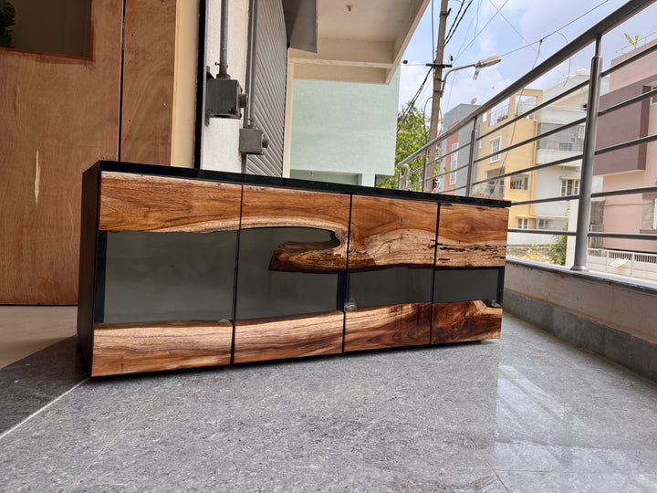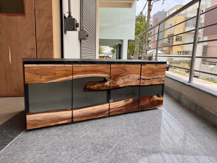 Teak Wood and Transparent Resin TV Unit Cabinet – A Fusion of Nature and Modern Elegance