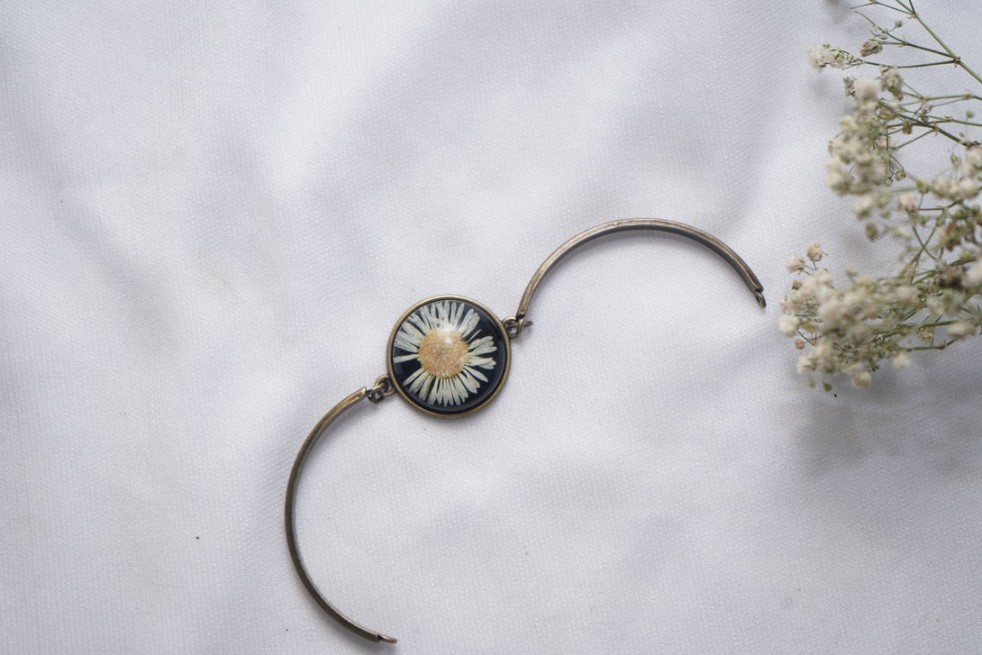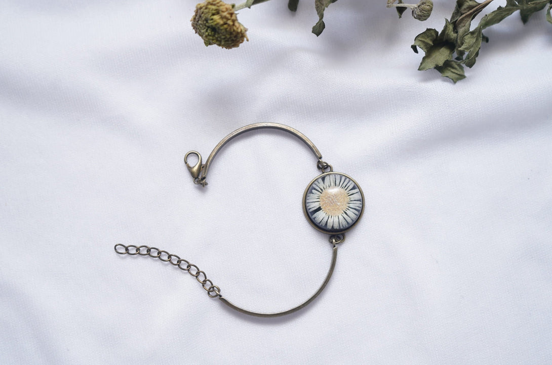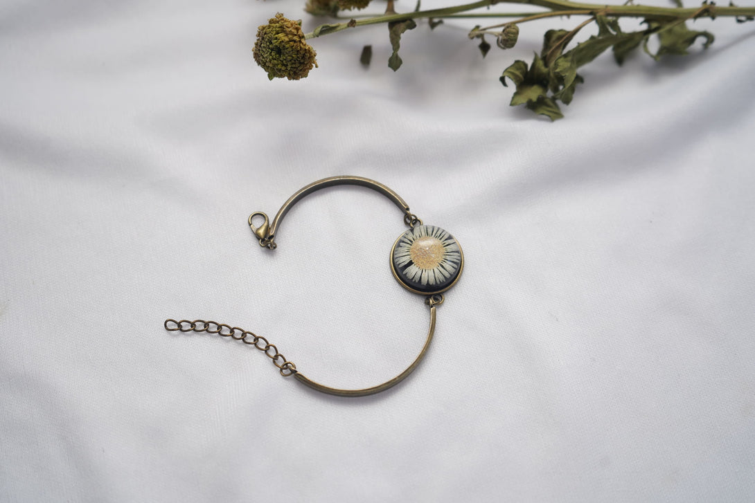 - Handcrafted bracelet featuring real flowers preserved in clear resin.