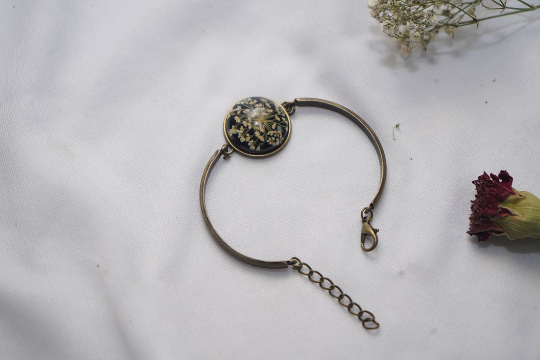 The Annes lace green flower bracelet is a stunning piece of handmade jewelry, featuring real flowers preserved in transparent resin. It showcases various flowers meticulously arranged and can come in different colors and sizes, with added embellishments for sparkle.