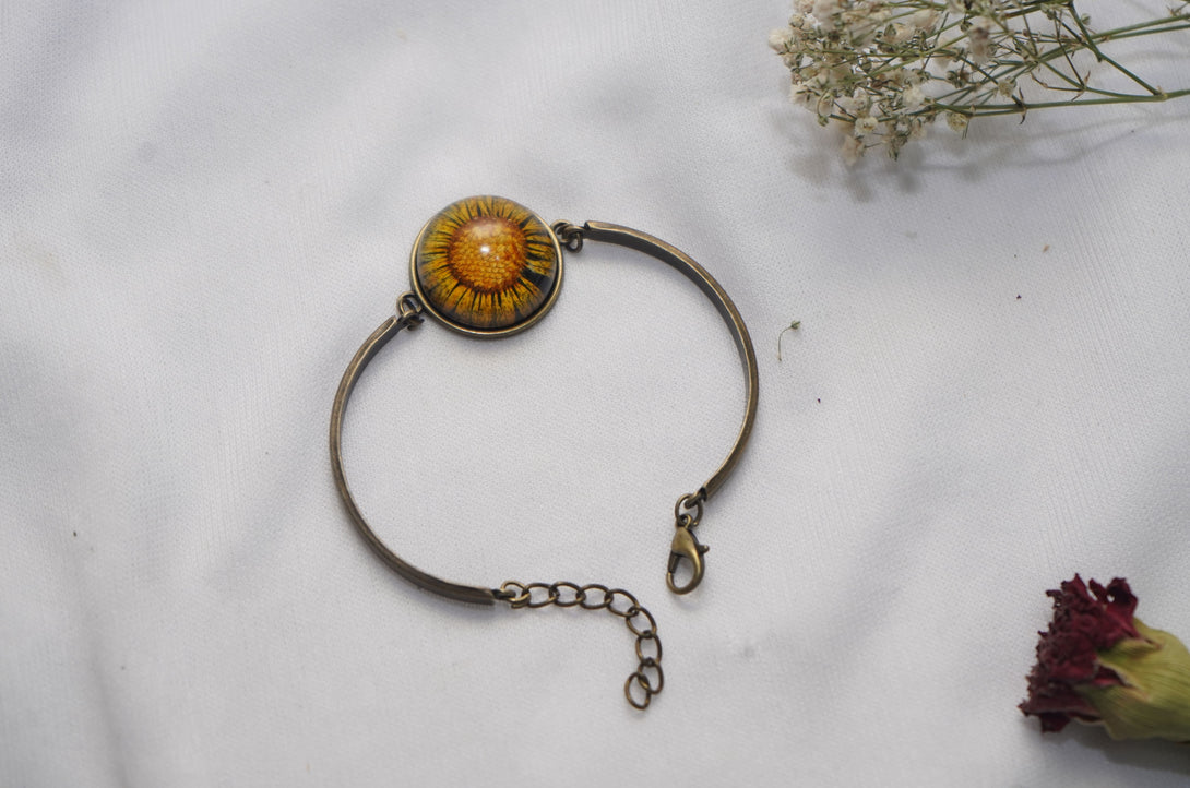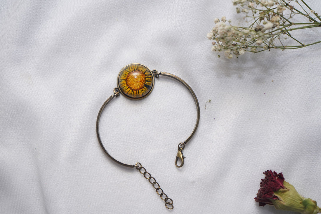 - Handcrafted bracelet featuring real flowers preserved in clear resin.
