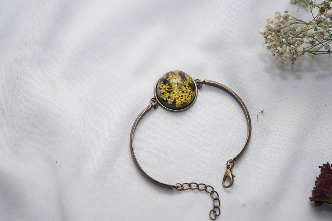 The Annes lace green flower bracelet is a stunning piece of handmade jewelry, featuring real flowers preserved in transparent resin. It showcases various flowers meticulously arranged and can come in different colors and sizes, with added embellishments for sparkle.