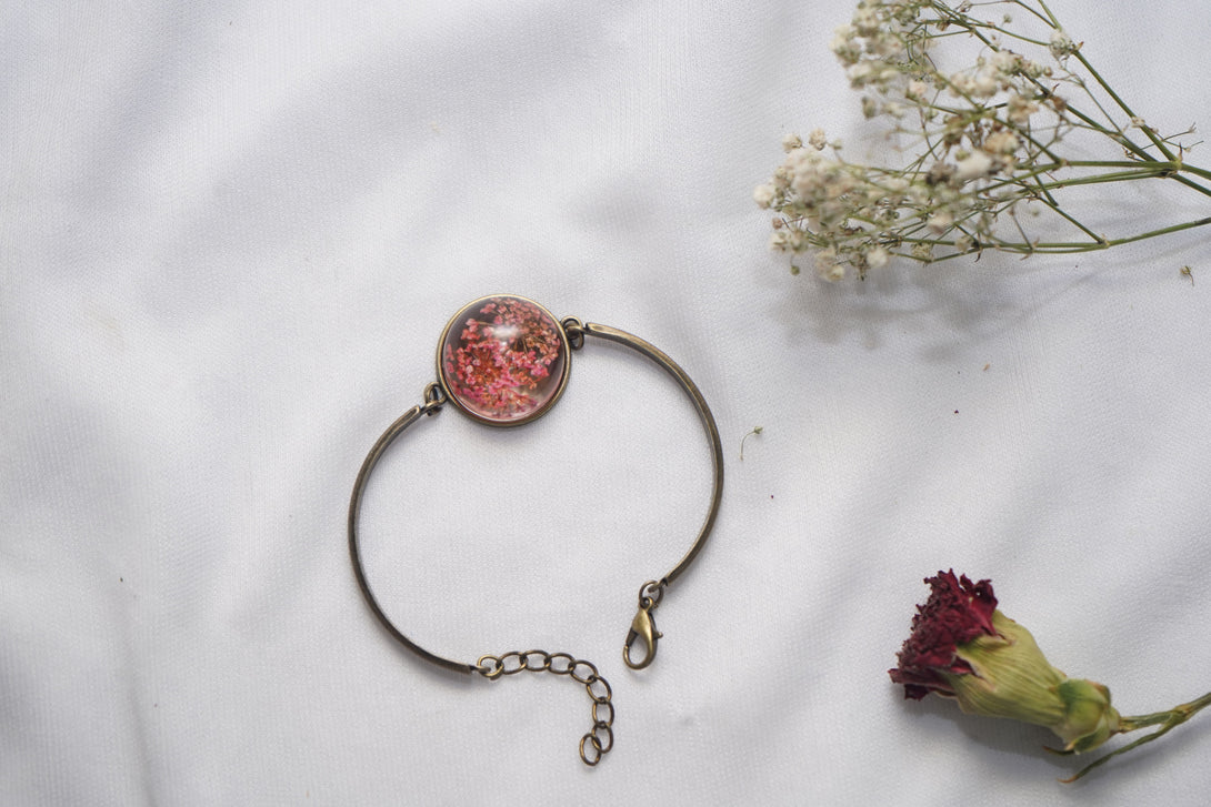 Whether as a personal treat or a thoughtful gift, the Pink Real Flower Anne’s Lace Bracelet offers a unique blend of natural charm and artisanal craftsmanship.