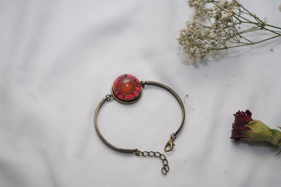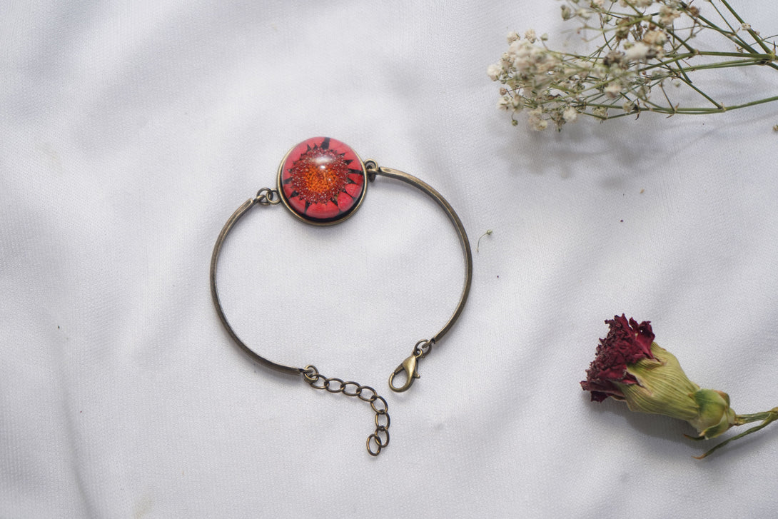 - Handcrafted bracelet featuring real flowers preserved in clear resin.