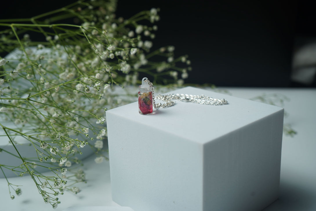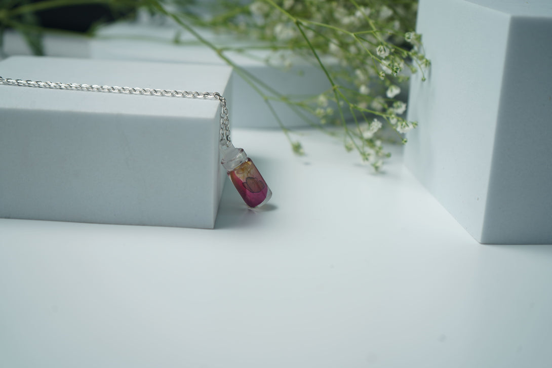 The small bottle pendant combines the charm of these natural elements with a classic vintage-inspired design. This unique accessory adds a touch of whimsy and sophistication to any outfit, making it perfect for both everyday wear and special occasions.