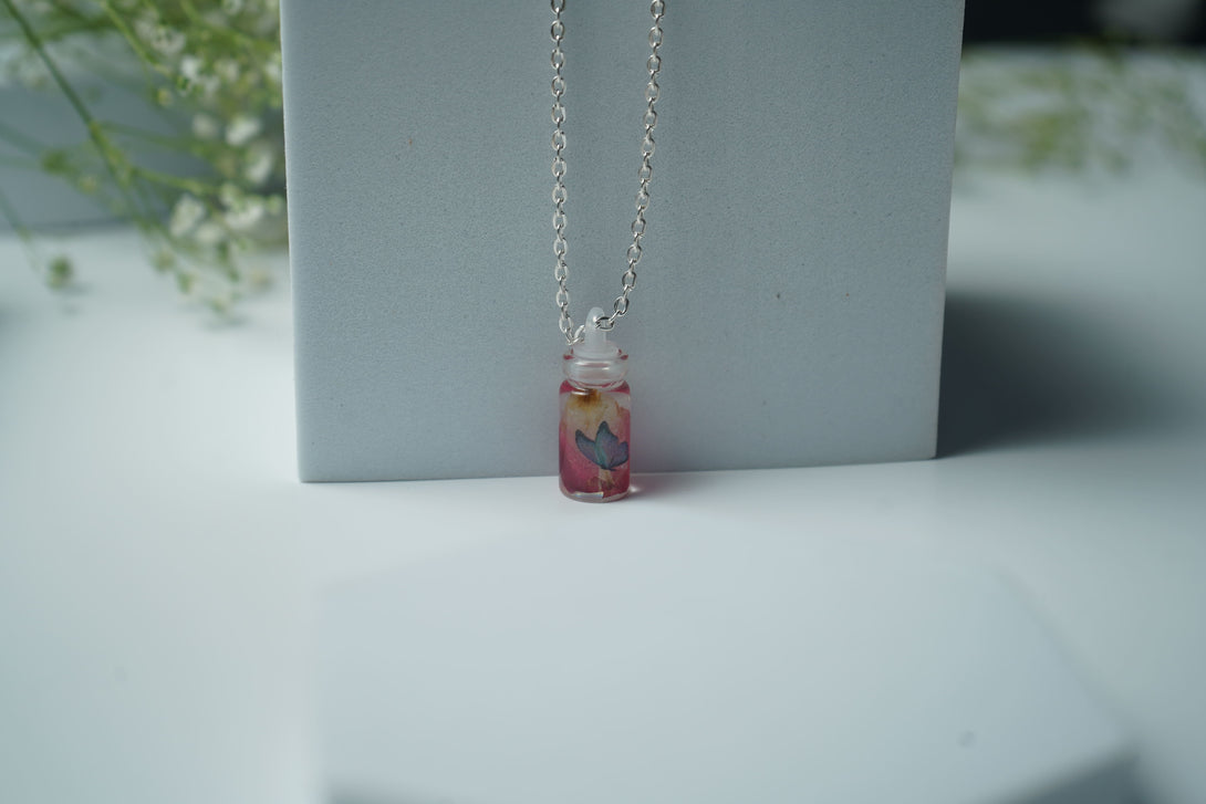 Tags: butterfly pendant, rose petal necklace, small bottle jewelry, nature-inspired pendant, whimsical butterfly and flower, miniature glass pendant