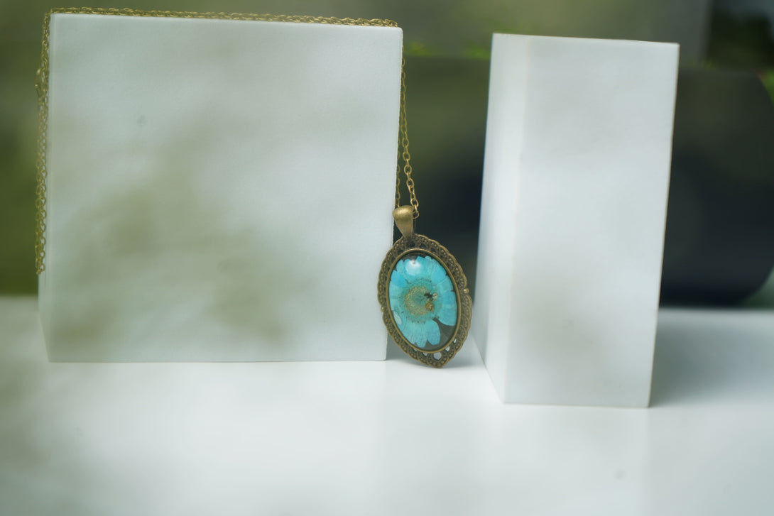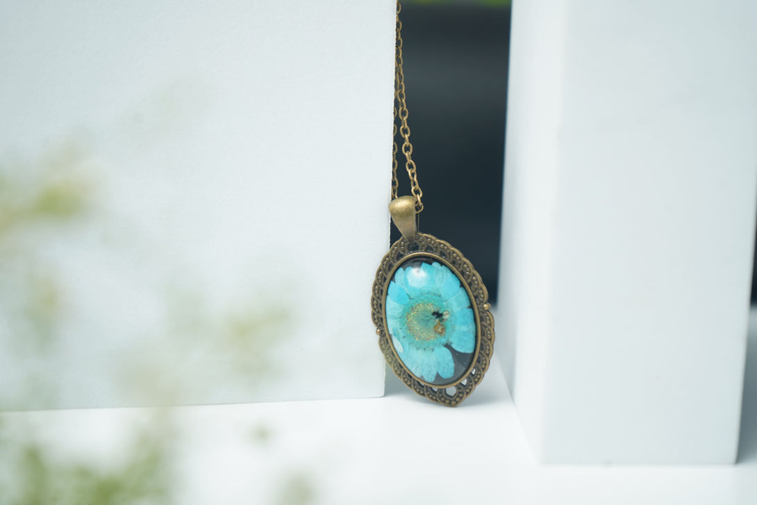Tags: blue daisy pendant, antique oval necklace, vintage daisy jewelry, preserved flower pendant, classic floral pendant, antique flower jewelry