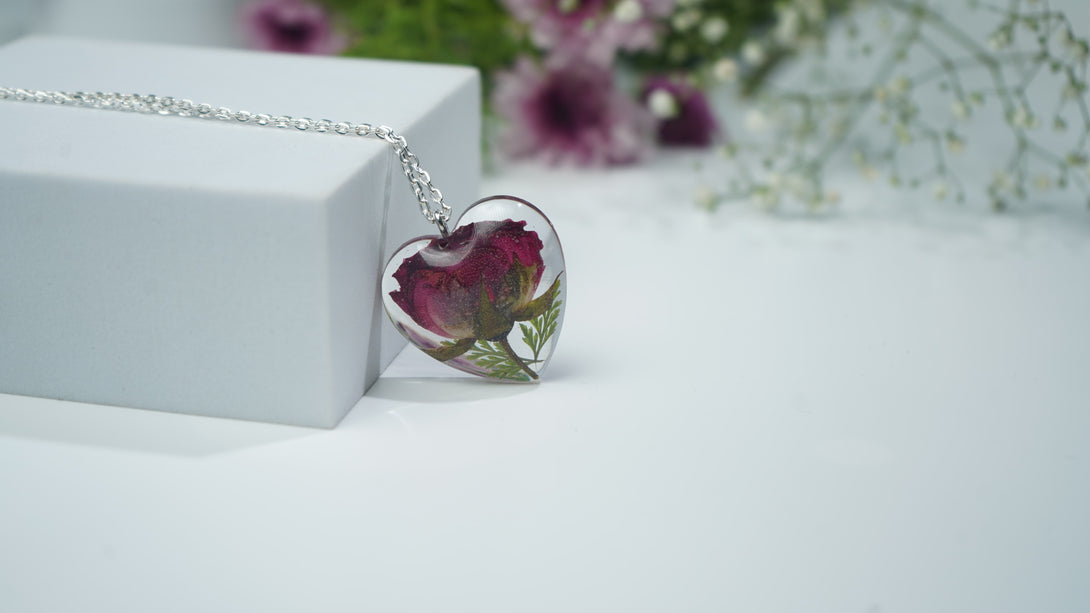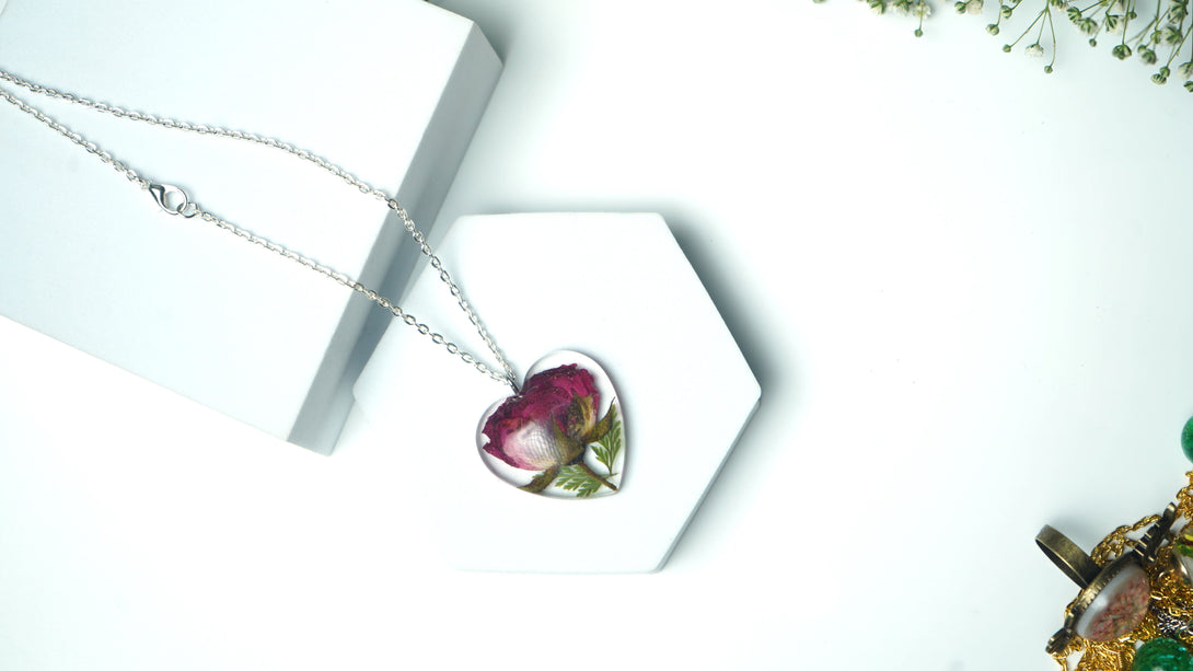 Capture the timeless beauty of nature with our Dried Original Rose Pendant, encased in a delicate silver heart. This pendant features a real dried rose, preserved to maintain its vibrant color...