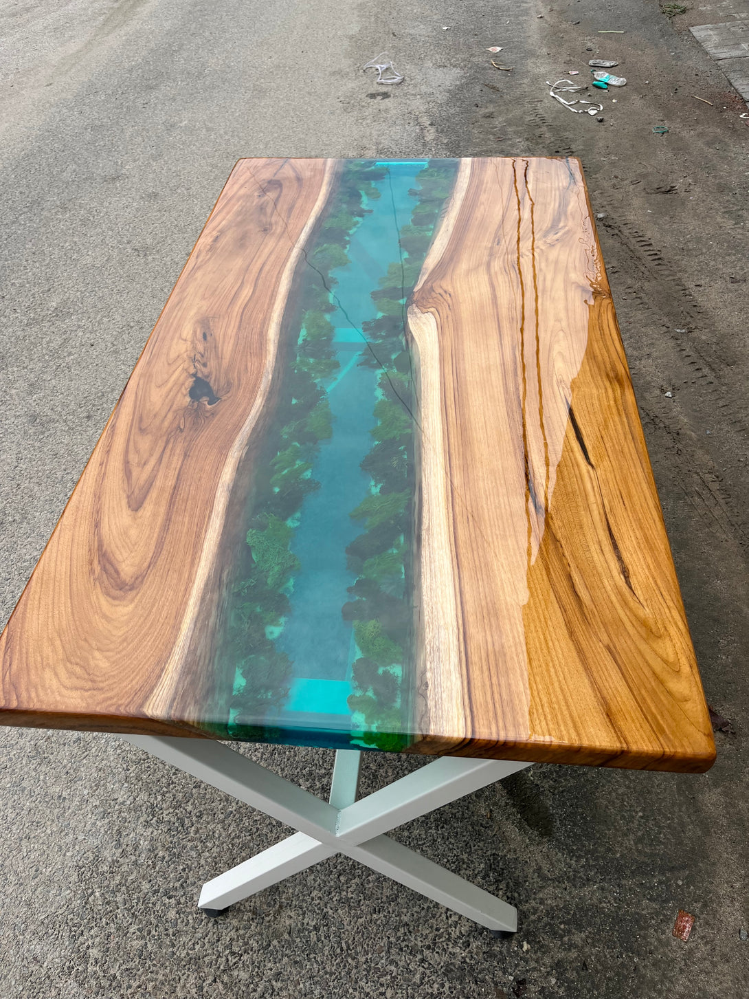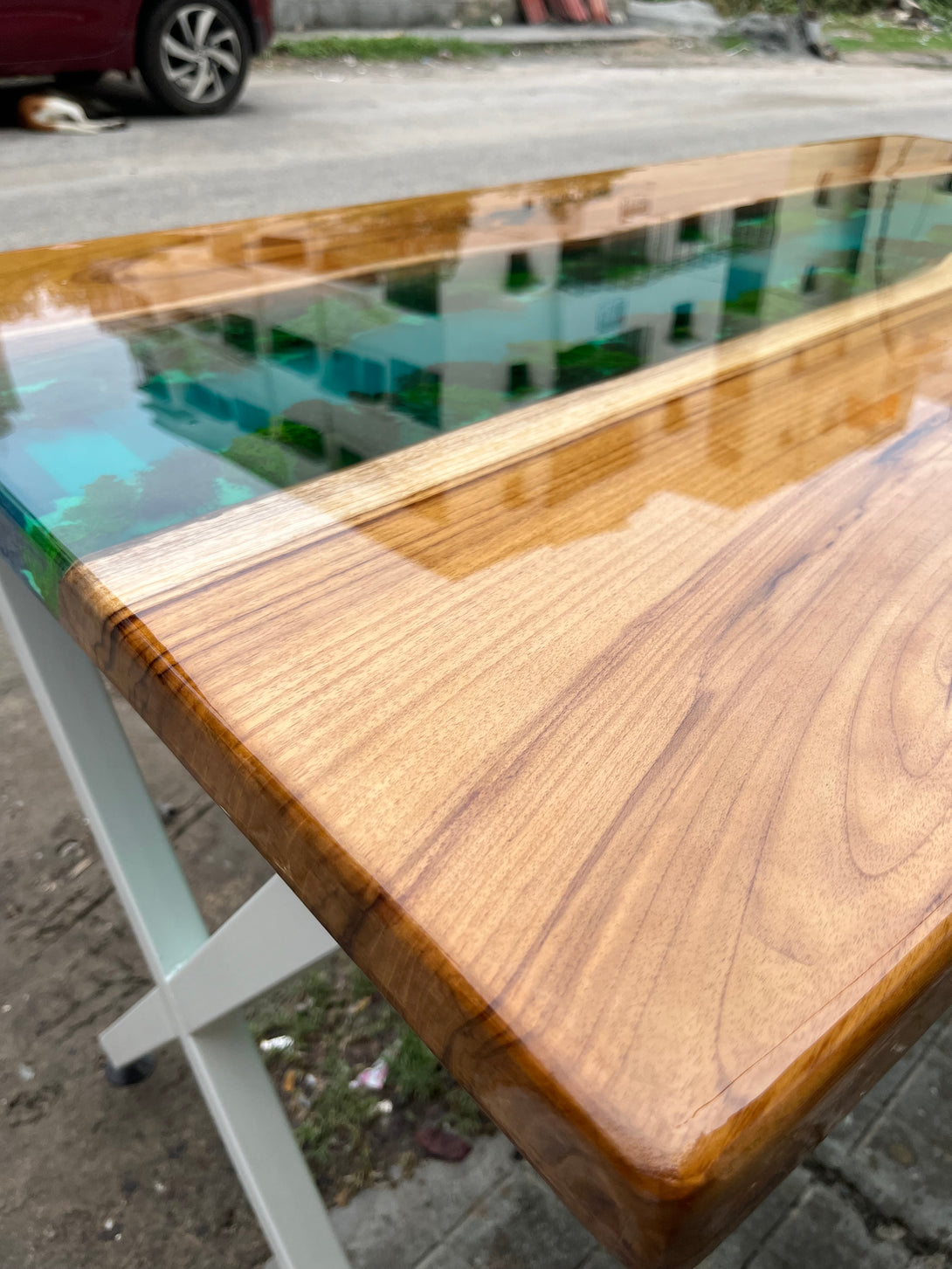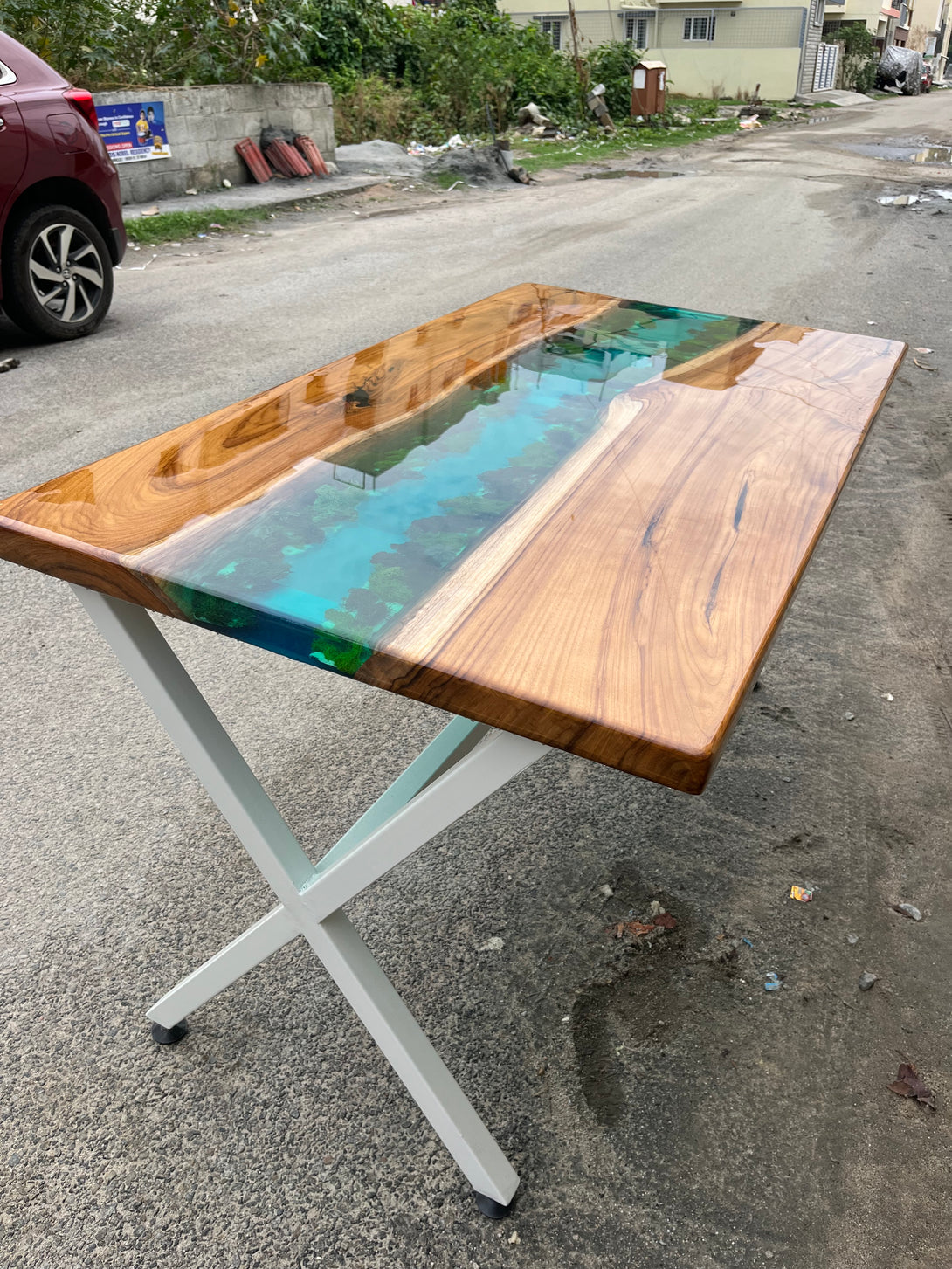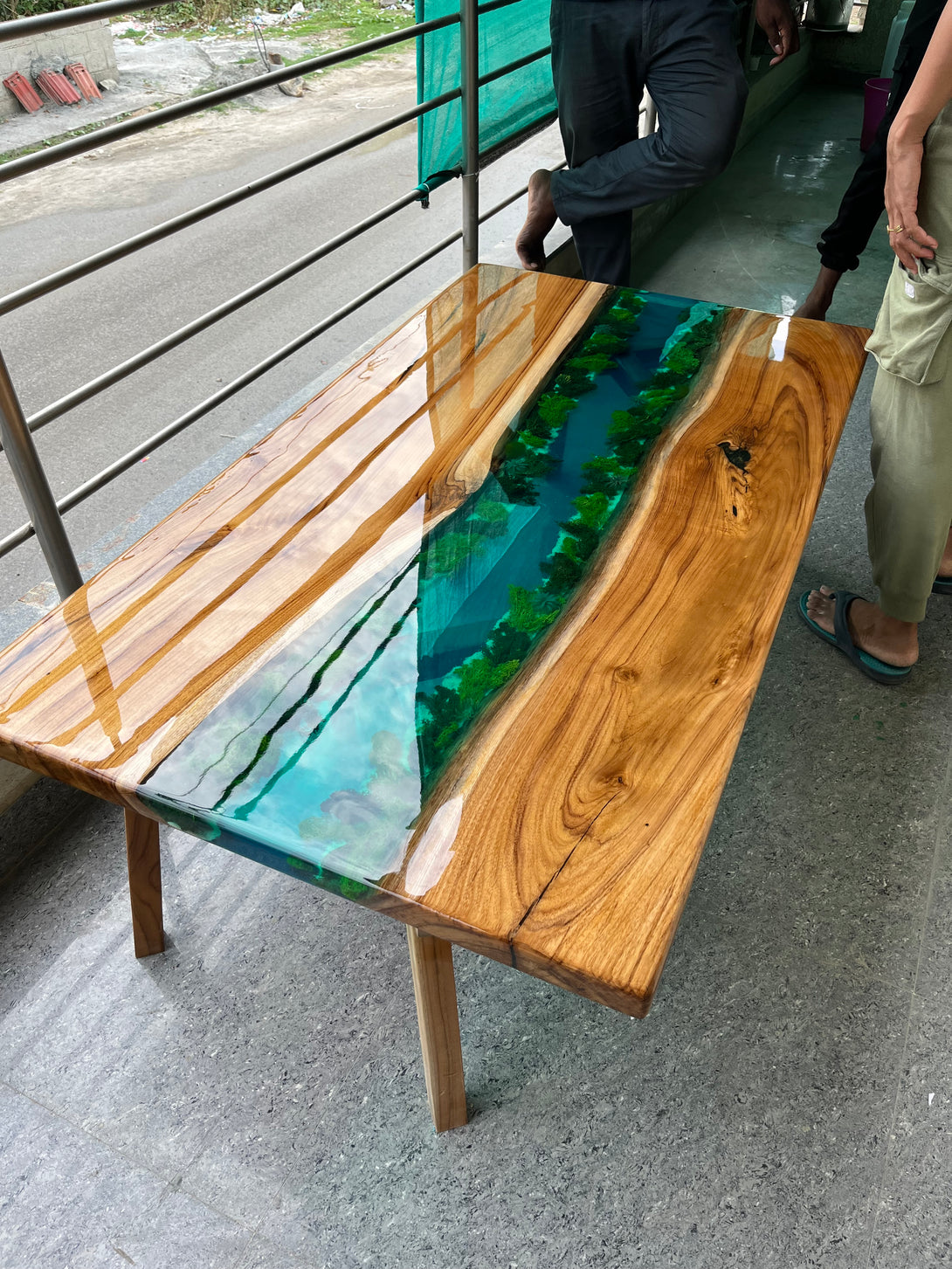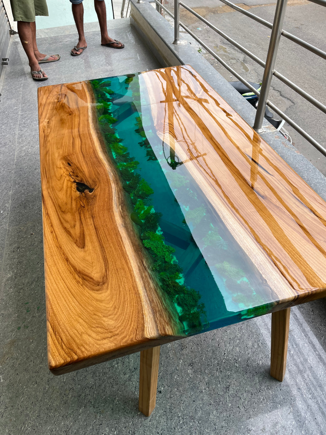 Live Edge Teak Wood Epoxy Resin Dining Table with Teal Forest – Handmade in India