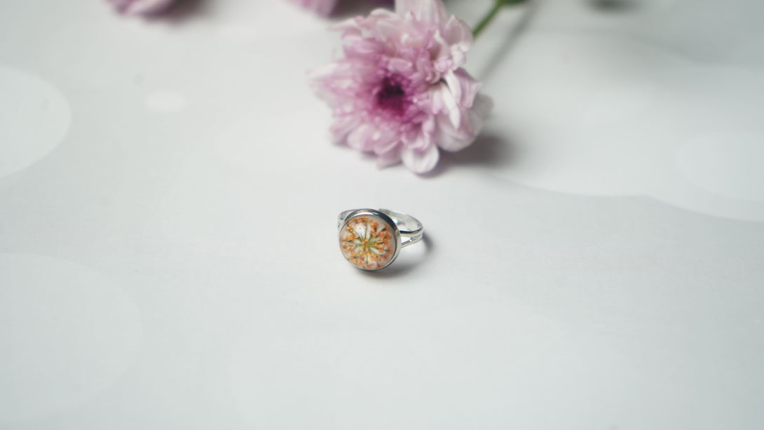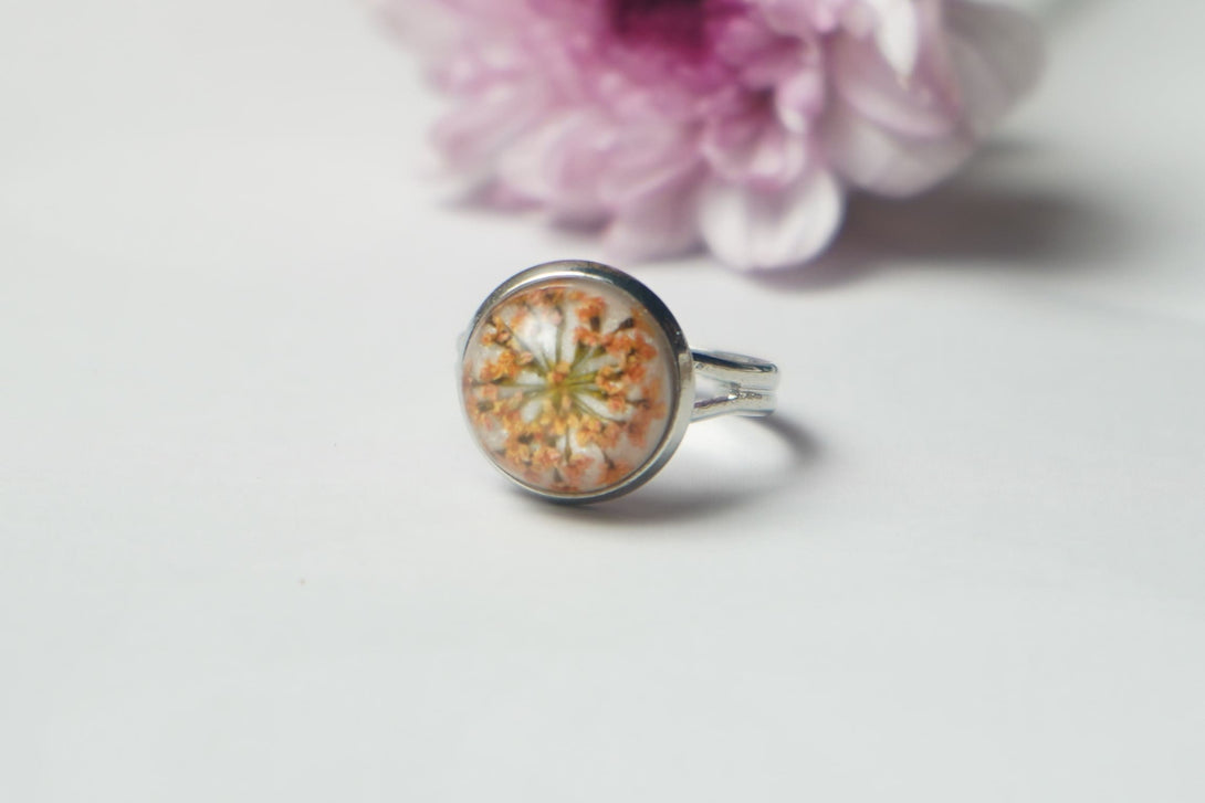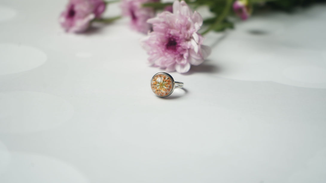 Each ring is a one-of-a-kind creation, featuring a real Annes flower preserved with delicate care. The bright orange petals stand out beautifully against the pure white resin, creating a stunning contrast that draws the eye and adds a pop of color to any outfit.