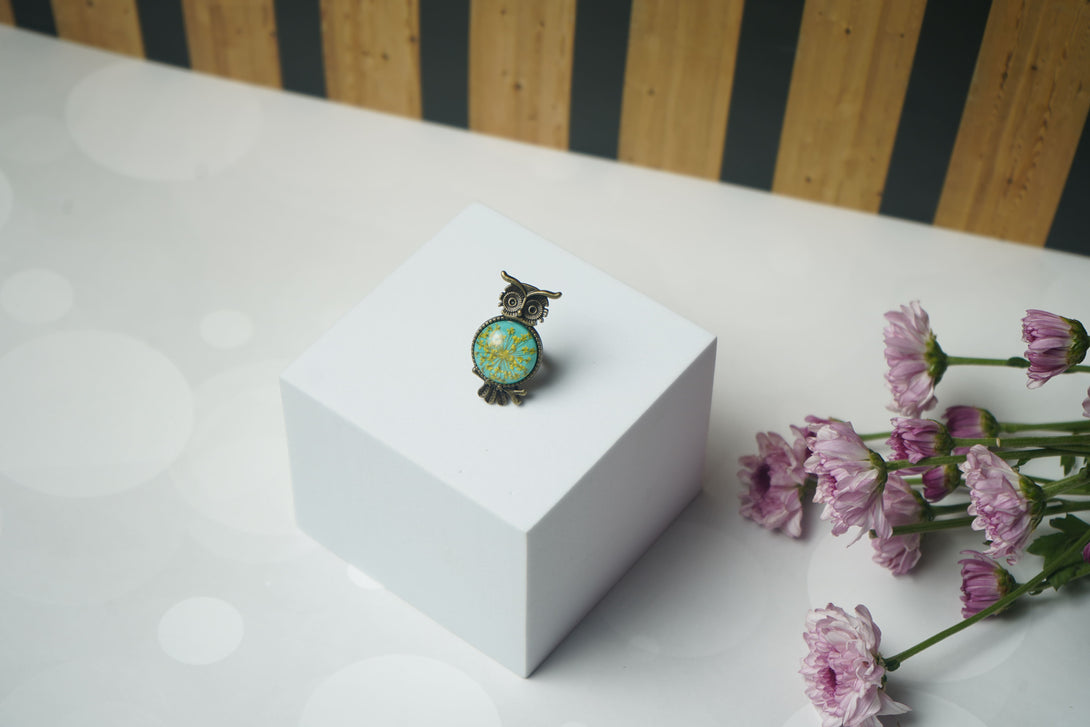 Each ring features a real yellow Annes flower preserved with meticulous care, showcasing its radiant petals against the backdrop of the eye-catching teal green owl design. The lively teal green contrasts beautifully with the bright yellow flower, creating a striking and playful accessory that stands out.