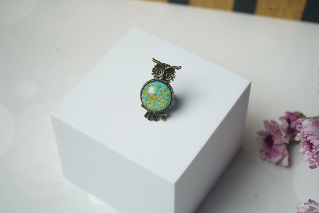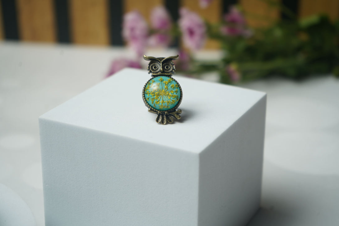 Brighten up your look with our Yellow Real Annes Flower with Teal Green Owl Resin Ring. This handcrafted piece beautifully combines the vibrant charm of a real yellow Annes flower with the playful allure of a teal green owl, all set against a sleek resin band. Perfect for those who appreciate unique and colorful jewelry, this ring adds a touch of elegance and whimsy to any outfit.