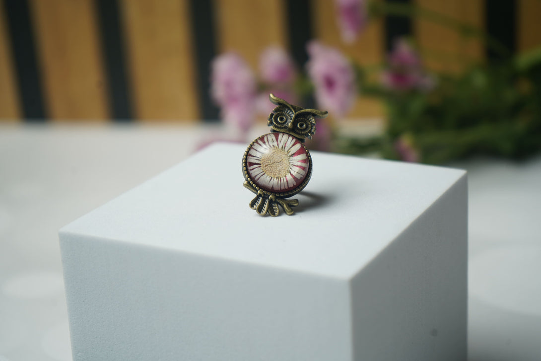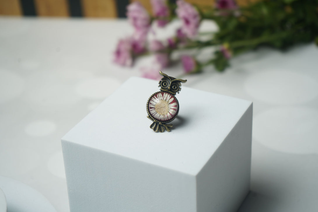 Each ring features a real white sunflower preserved with meticulous care, showcasing its pristine petals against the striking red owl design. The bright red owl adds a whimsical touch, creating a bold and eye-catching contrast with the elegant white sunflower. This playful combination makes the ring a standout accessory for any outfit.