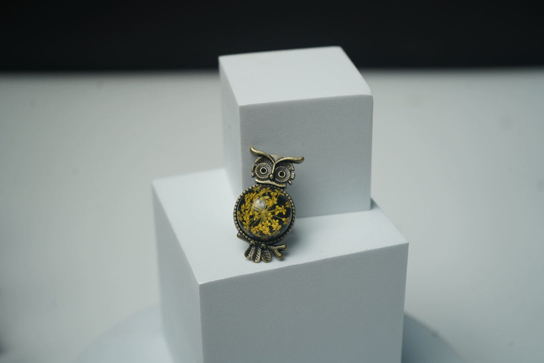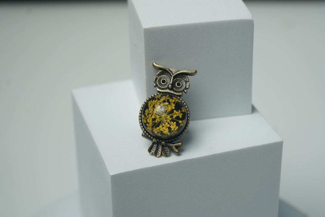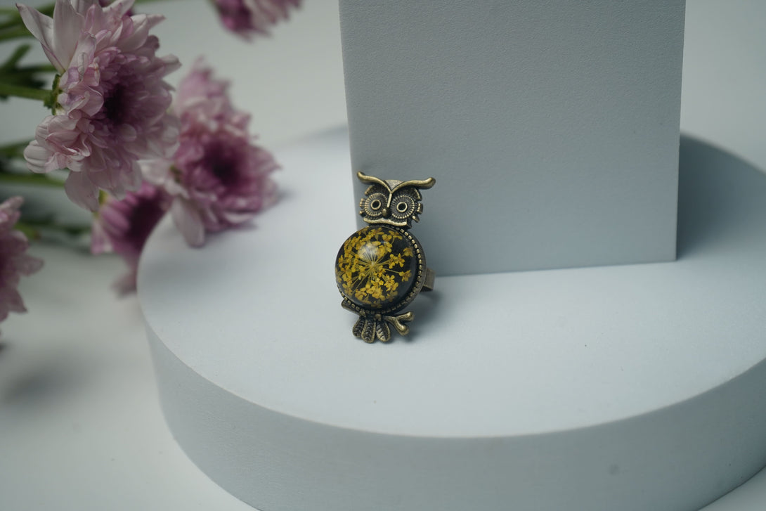 Each ring is a one-of-a-kind creation, featuring a real yellow Annes lace flower meticulously preserved in durable resin. The intricate lace-like texture of the flower is elegantly showcased, complemented by the striking black owl design that adds a whimsical element. The contrast between the bright yellow flower and the deep black resin creates a captivating and stylish accessory.