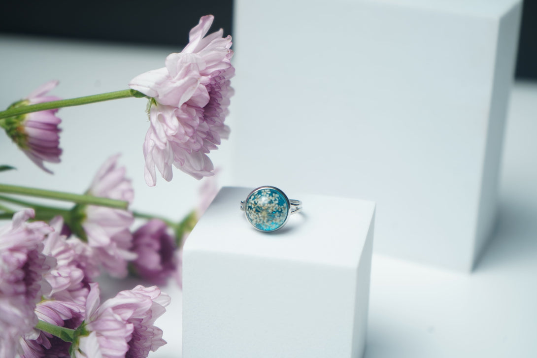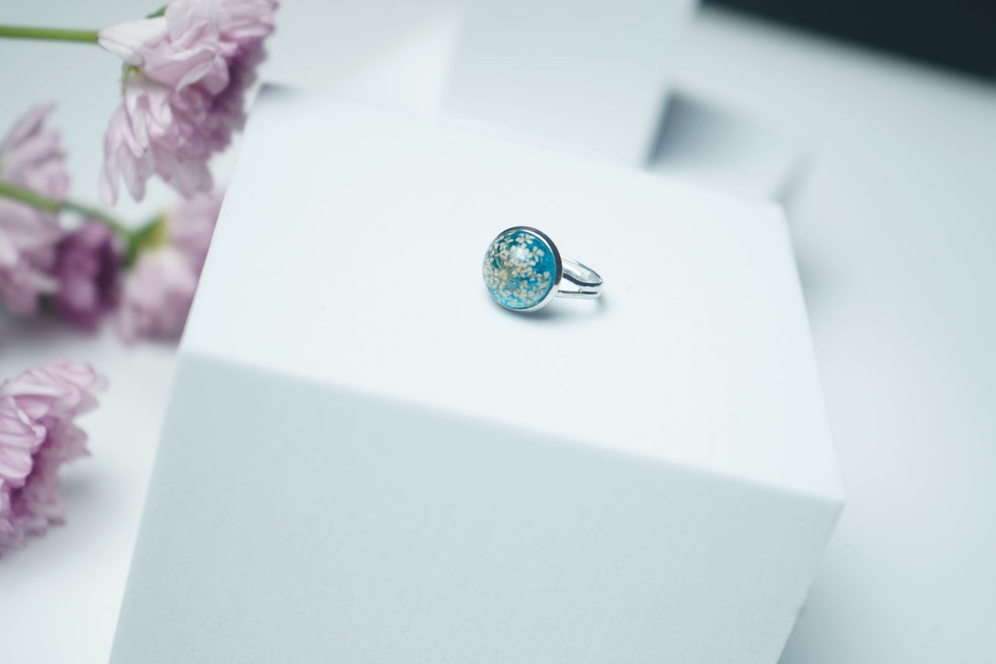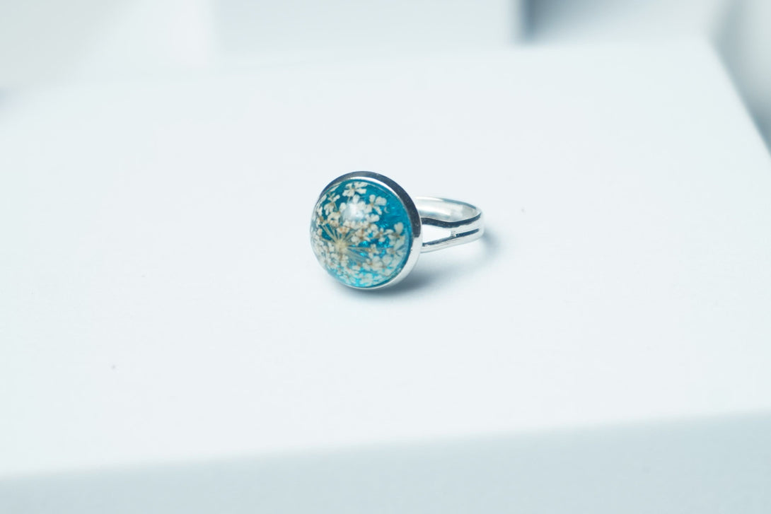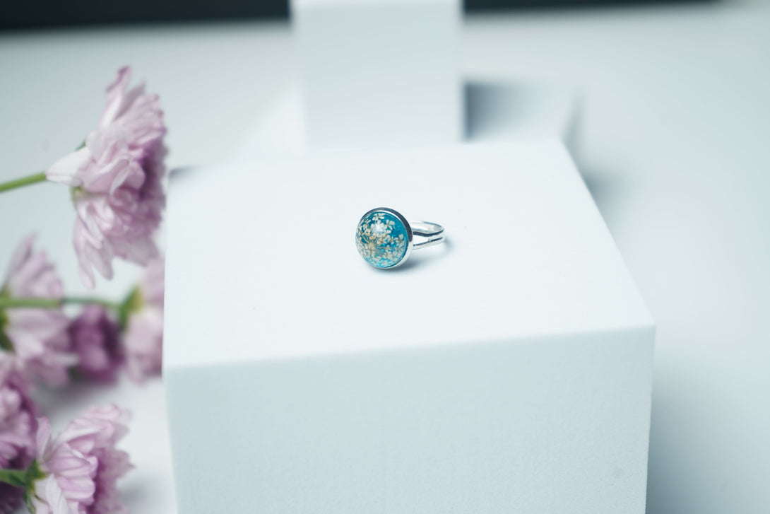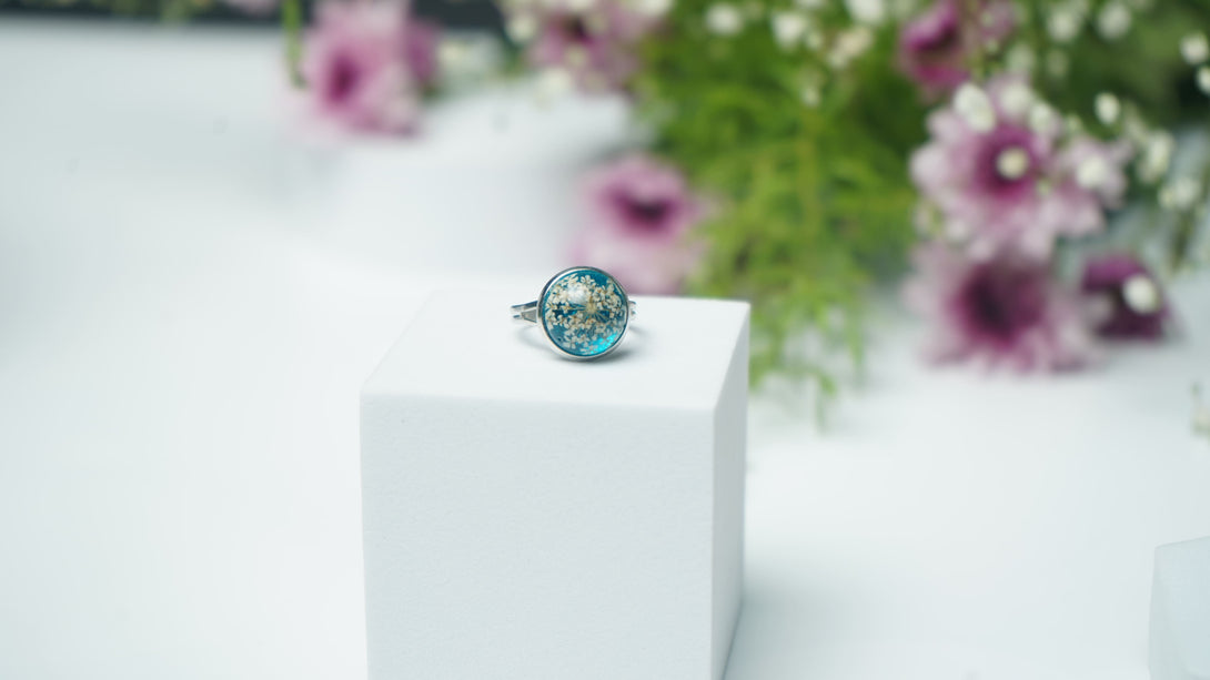 Each ring is a one-of-a-kind creation, featuring a real white Annes flower carefully preserved in durable resin. The pristine white petals are beautifully highlighted against the calming blue background, creating a graceful and serene visual effect that enhances any outfit.