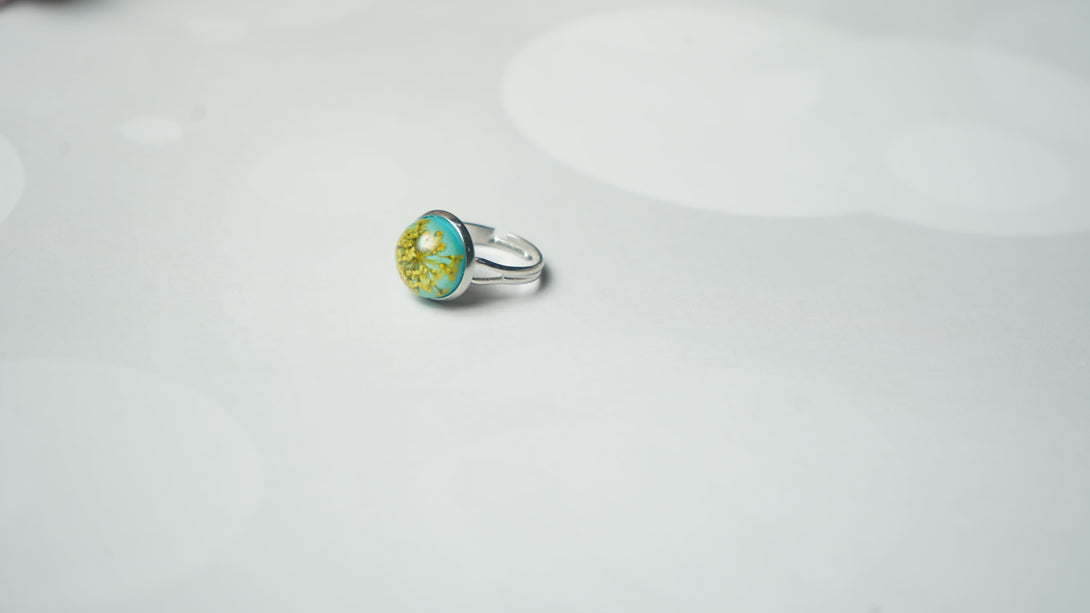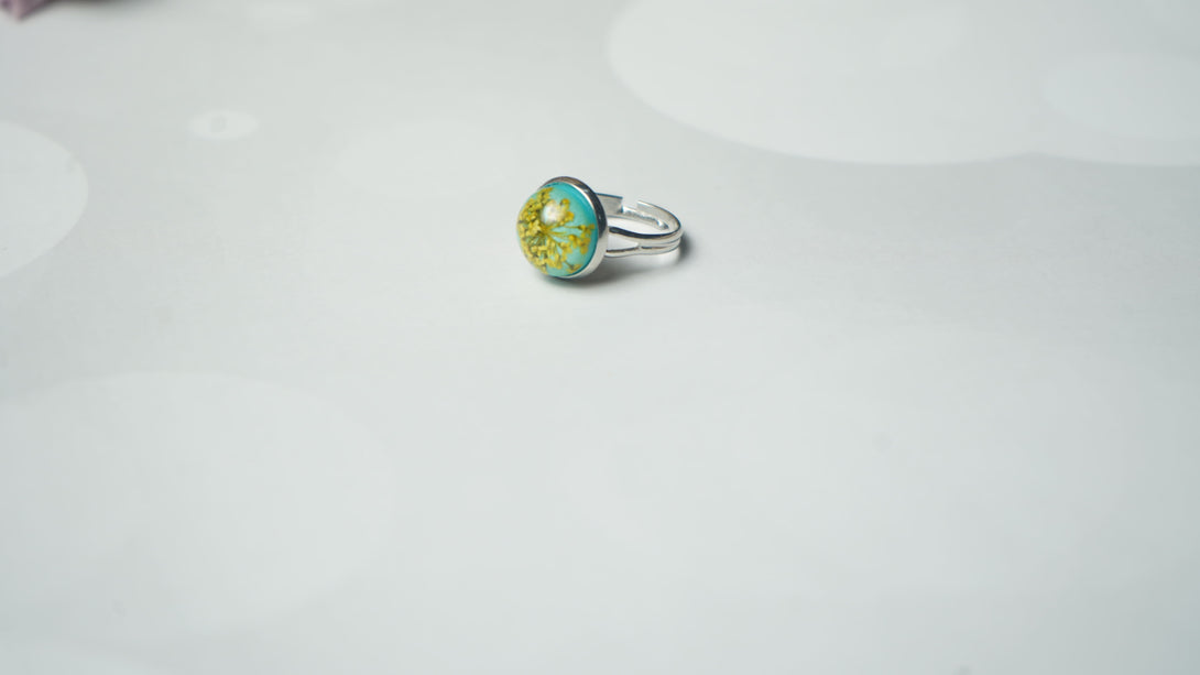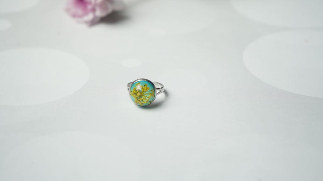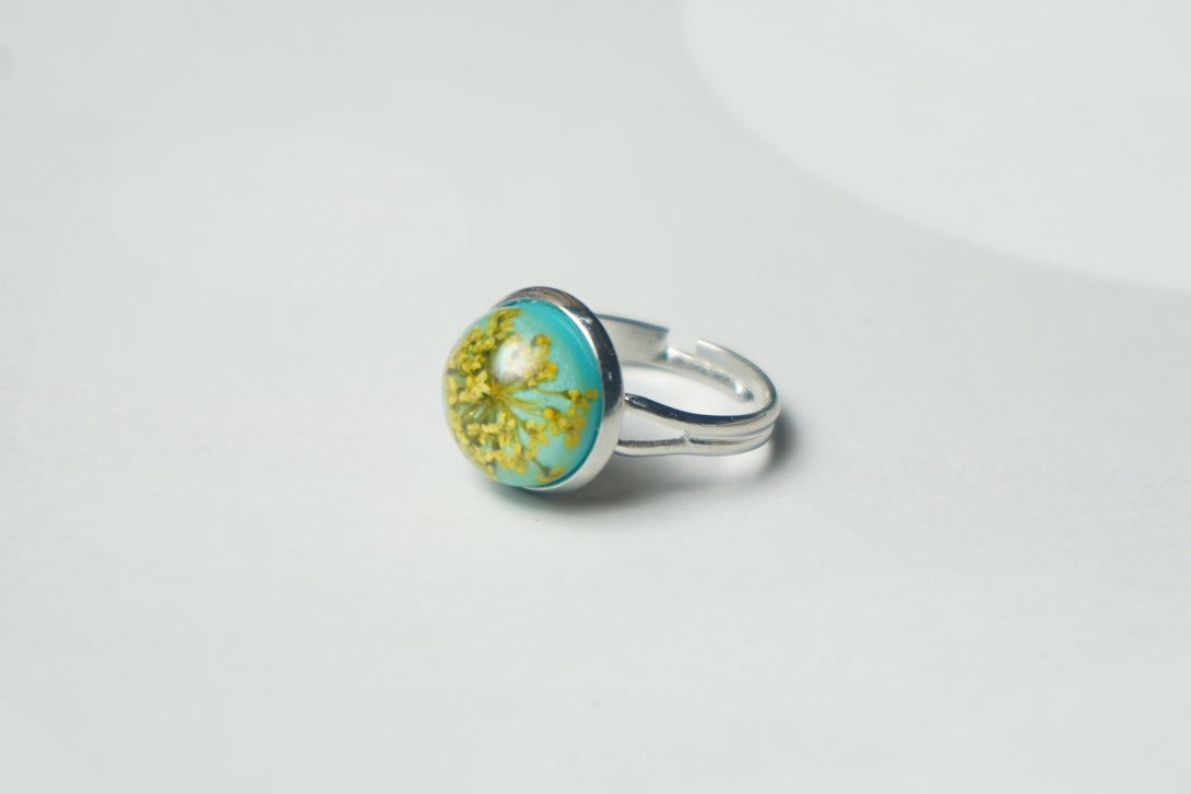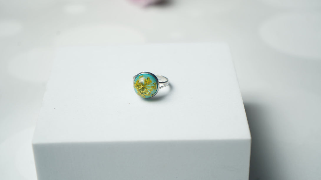 Each ring is a one-of-a-kind creation, featuring a real yellow Annes flower meticulously preserved in durable resin. The bright yellow petals are beautifully contrasted against the rich teal background, creating a captivating display that adds a pop of color to any outfit.