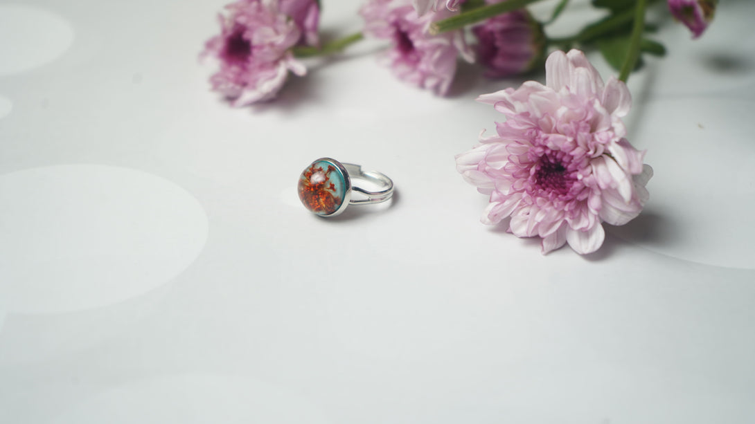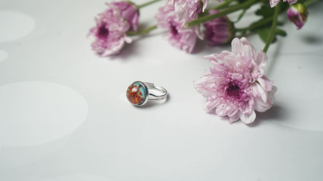 Add a bold splash of color to your jewelry collection with our Red Real Annes Flower with Light Blue Resin Ring. This handcrafted piece beautifully captures the vibrant allure of a real Annes flower, set against a serene light blue resin band. Perfect for those who love unique and eye-catching accessories, this ring offers a stunning contrast that’s sure to turn heads.