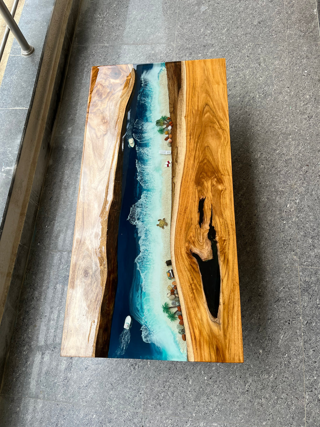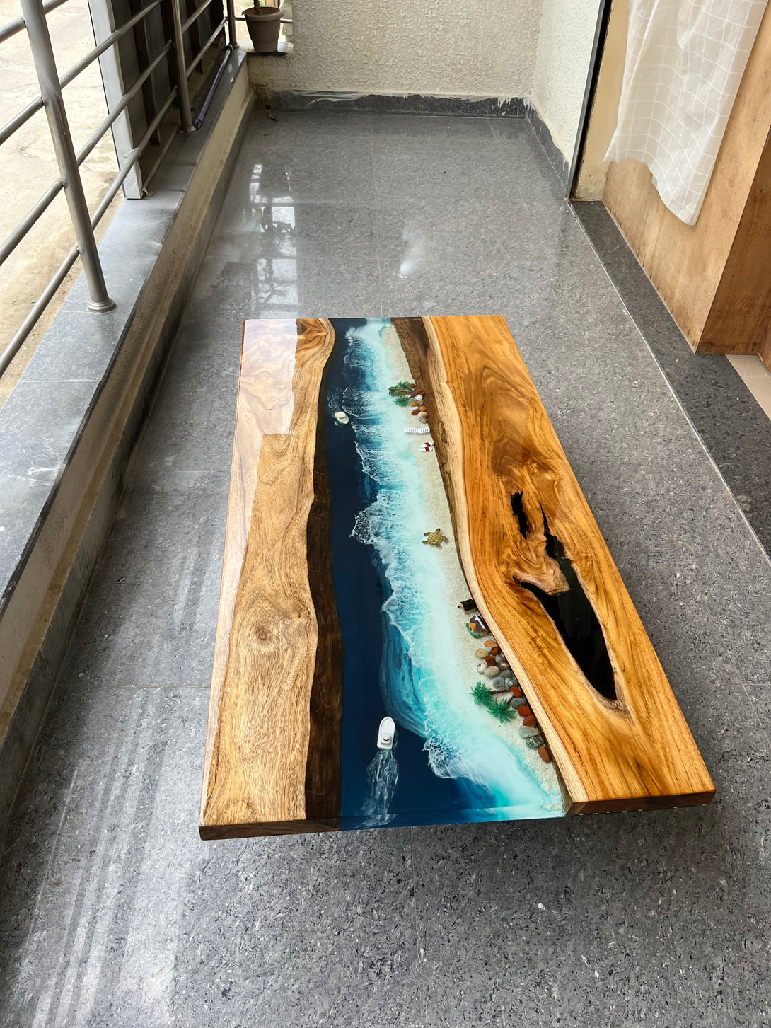 Bring the beauty of the sea into your home with the Ocean Design Epoxy Resin Centre Table. This one-of-a-kind table combines the elegance of natural wood with stunning, hand-crafted resin artwork...