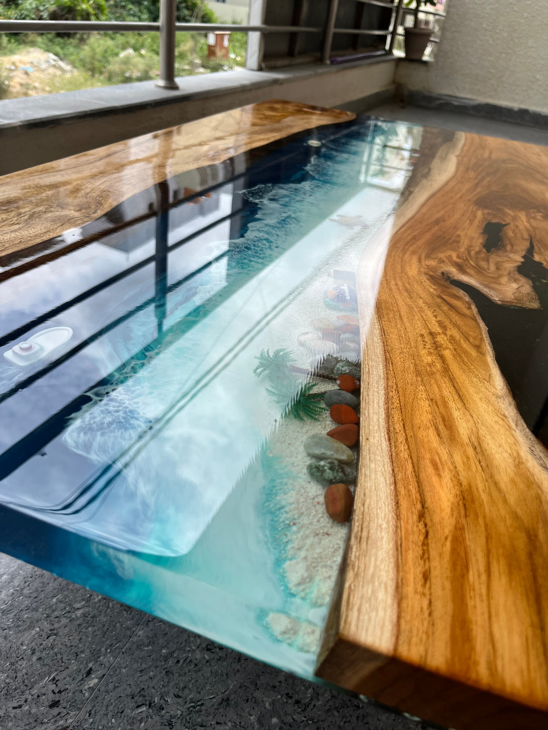 Each piece is custom-built by local artisans in Bangalore using premium quality materials, including seasoned teak wood and UV-resistant epoxy resin. Our tables are heat-resistant, scratch-proof, and made to last for years.