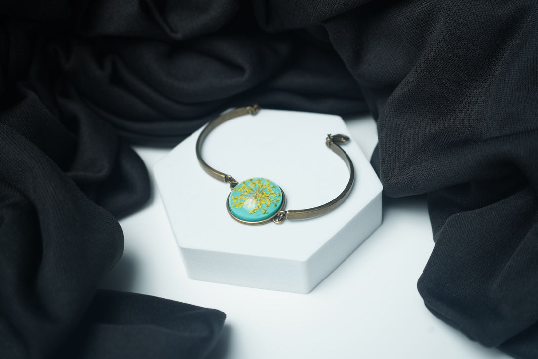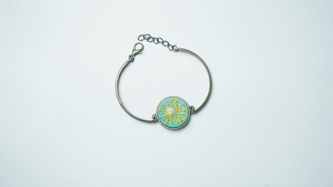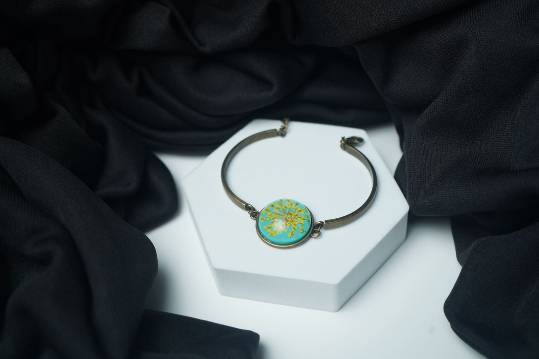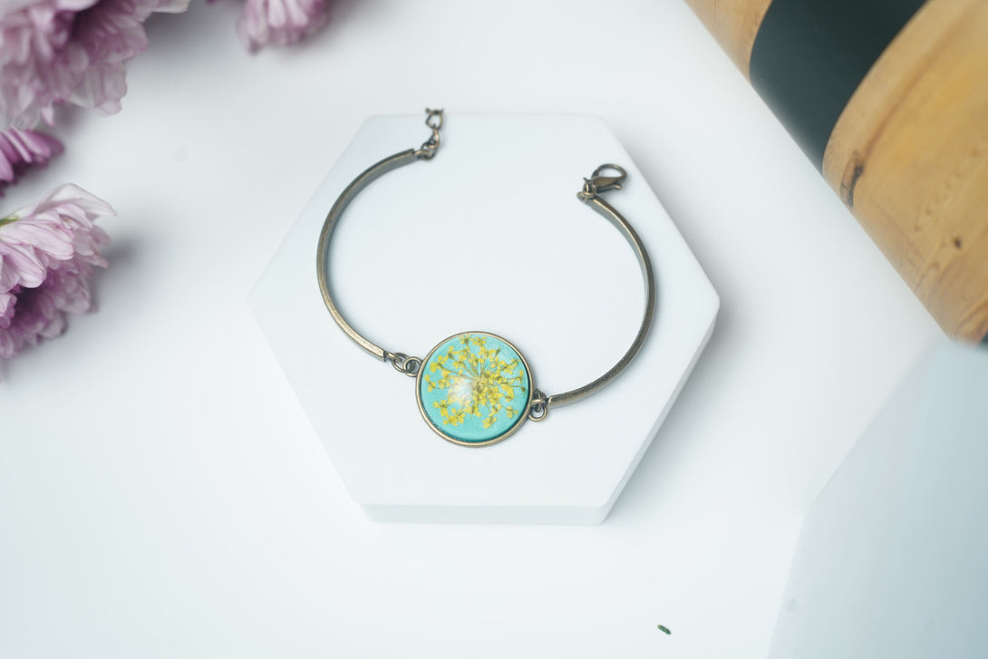 Brighten up your accessory collection with this stunning bracelet, featuring the delicate elegance of Yellow Annes lace paired with a vibrant teal hue. The intricate lace pattern, meticulously preserved in high-quality resin, offers a unique and timeless charm. Each bracelet is handcrafted to ensure that the Annes lace's intricate details and vibrant colors are beautifully showcased.