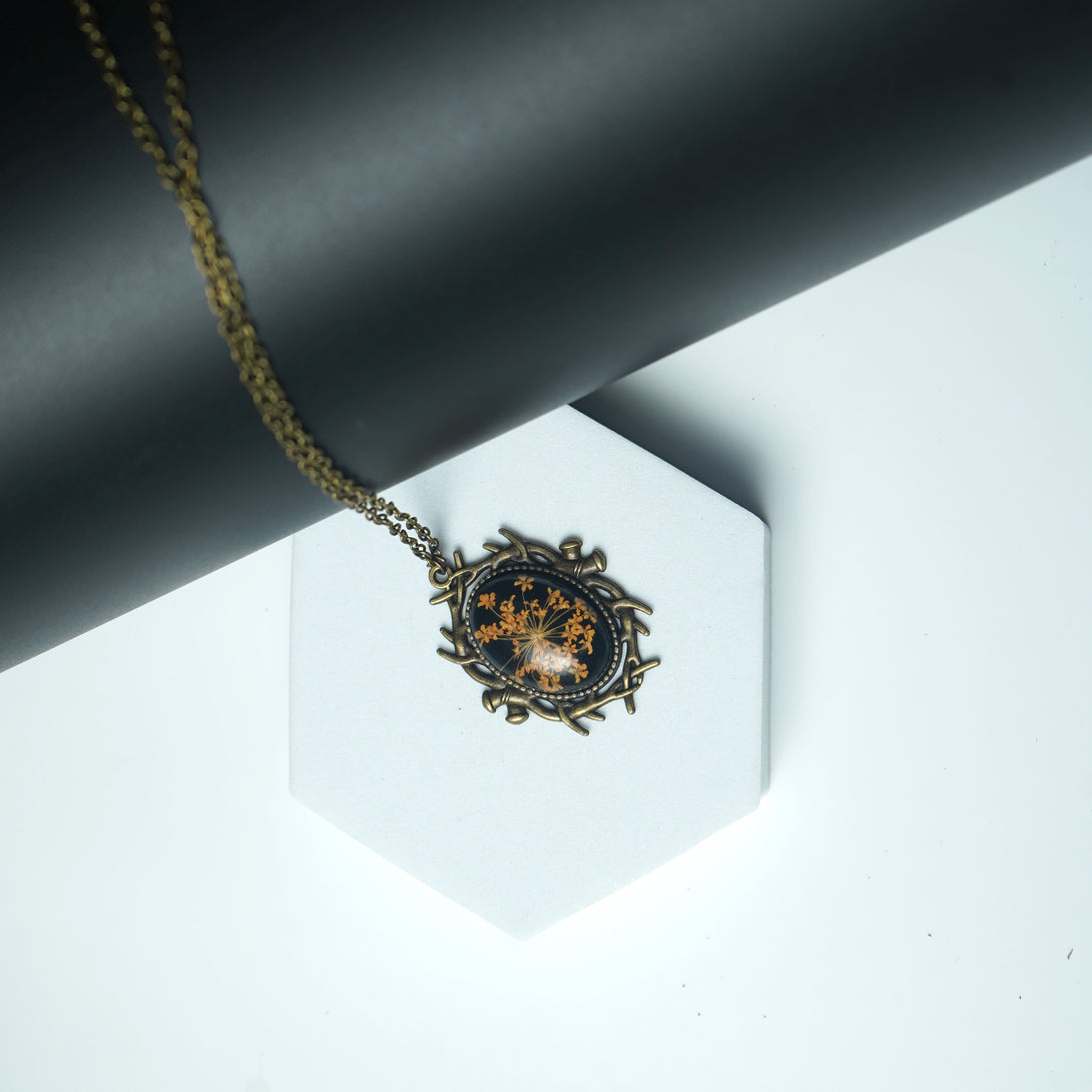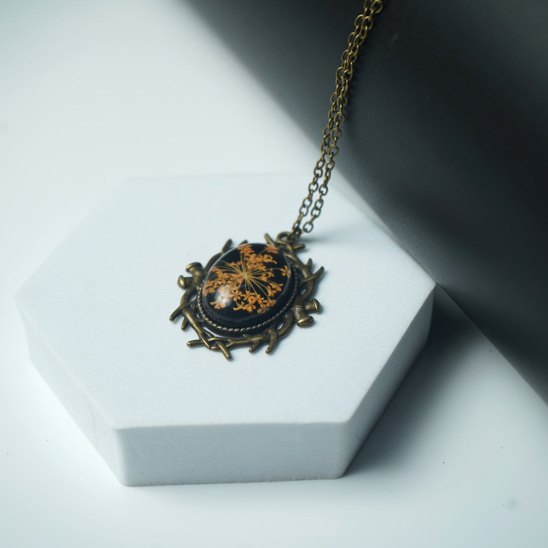 Tags: orange Annes pendant, antique finish necklace, vintage flower jewelry, preserved flower pendant, classic floral pendant, antique Annes jewelry