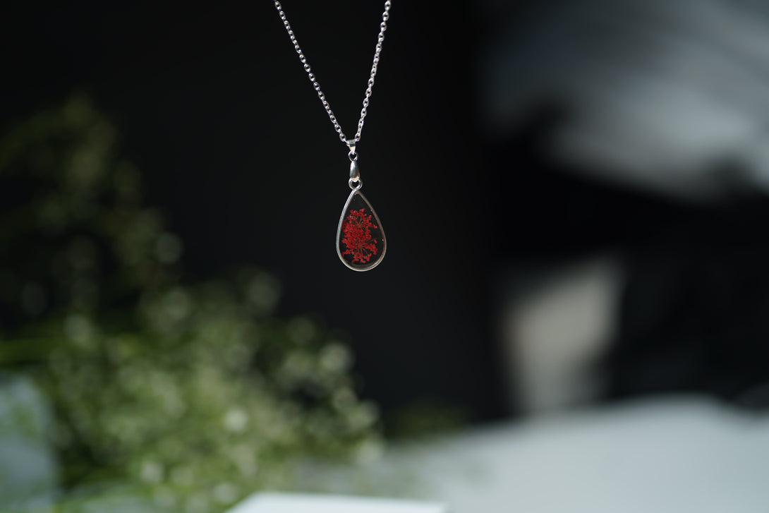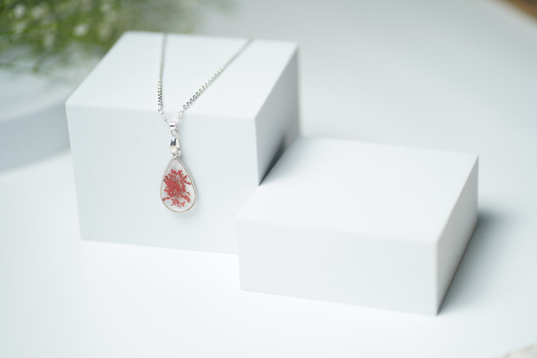 Add a touch of romantic elegance to your collection with our Pink Annes Blossom in Silver Drop Pendant. Featuring delicate Pink Annes flowers, carefully preserved to maintain their soft, natural beauty, this pendant exudes grace and sophistication. The pink blooms are encased in a polished silver drop-shaped pendant, creating a harmonious blend of color and style.