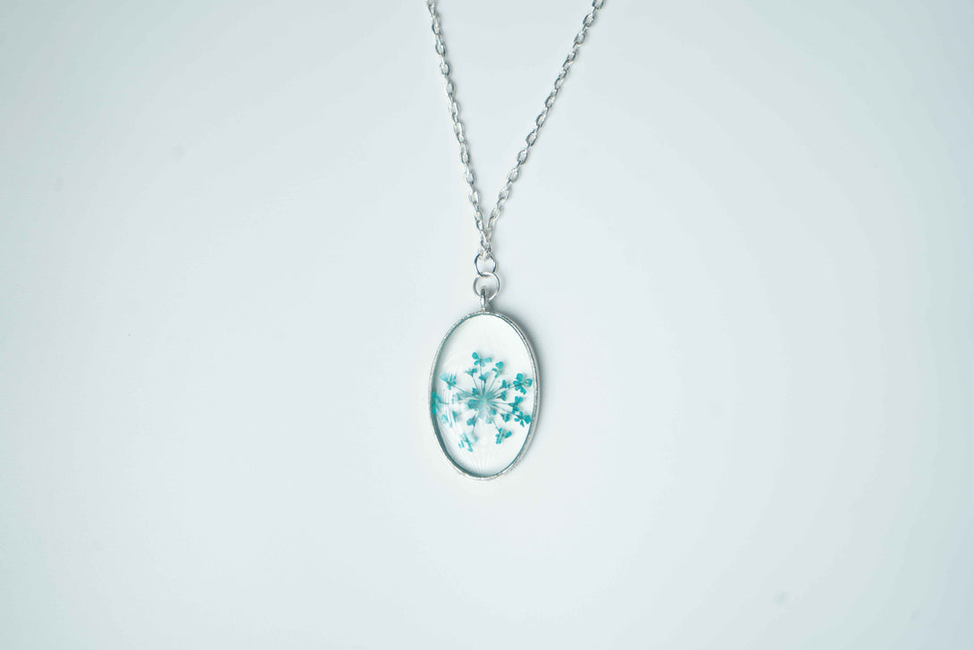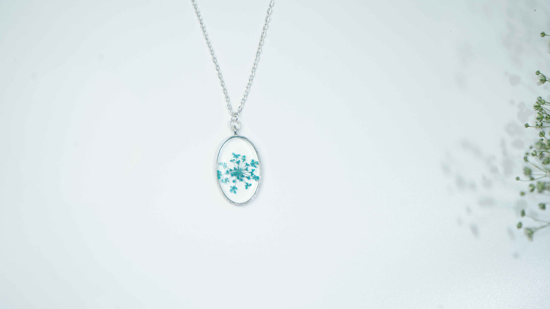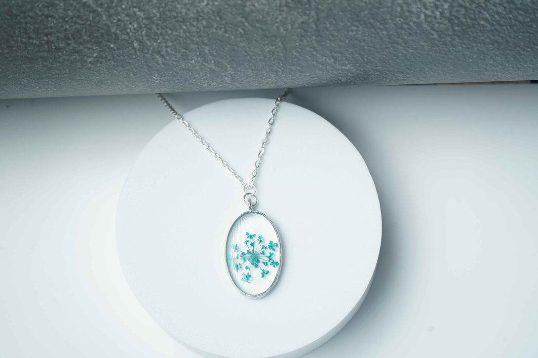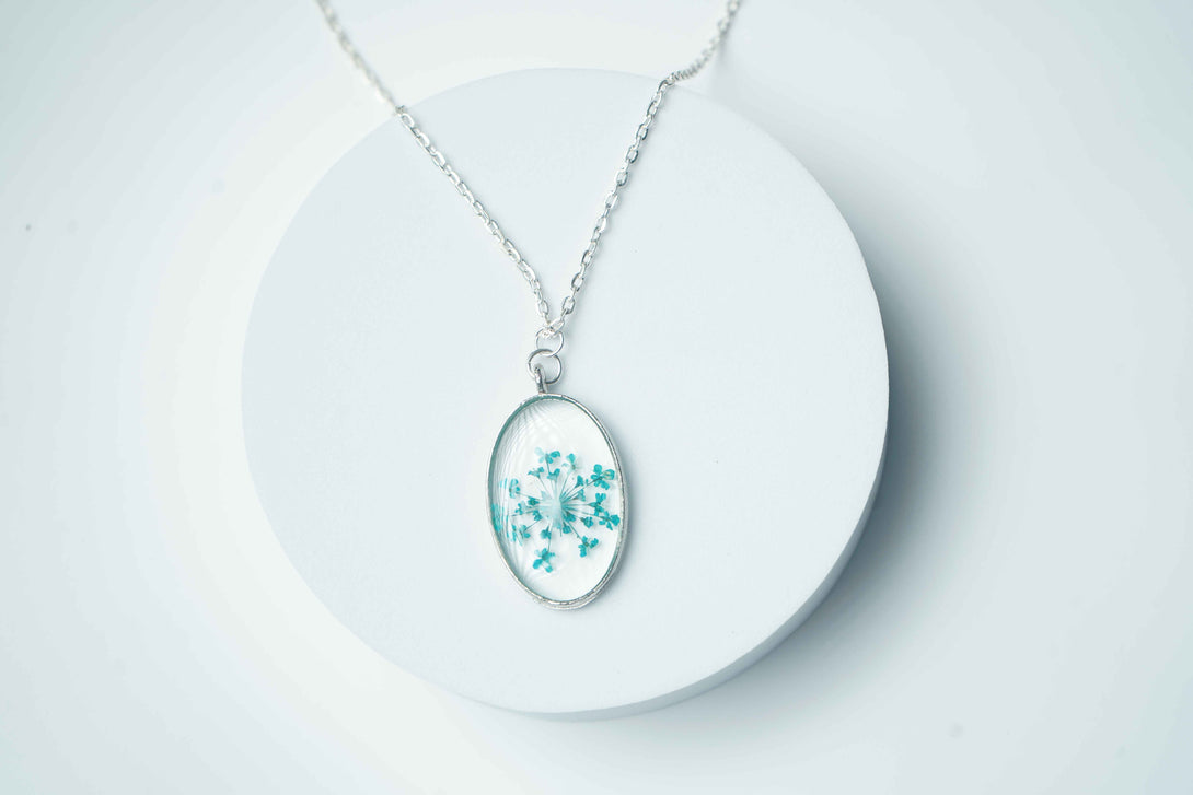 Embrace the tranquil beauty of nature with our Light Blue Annes Blossom Pendant, exquisitely set in an elegant silver oval frame. Key Points: Authentic Light Blue Annes Blossom: Features a real...