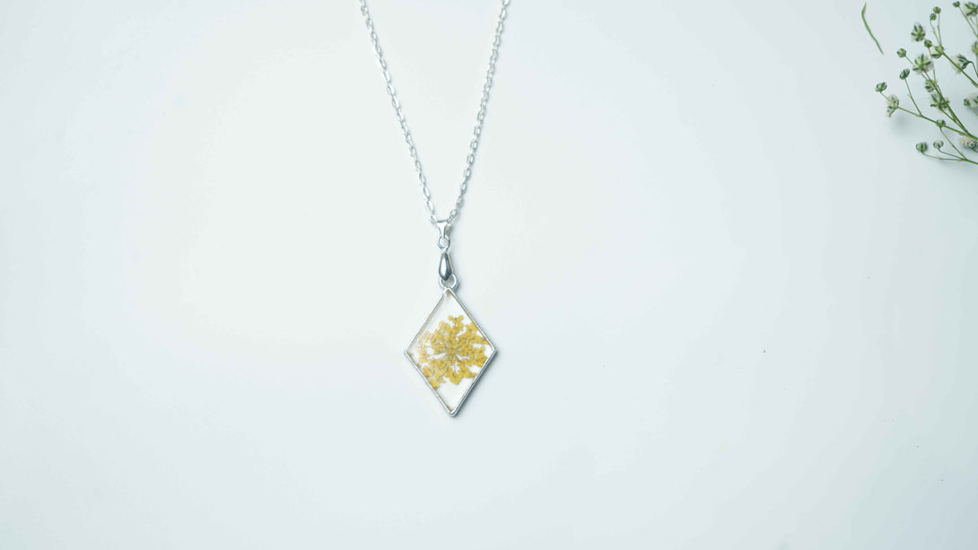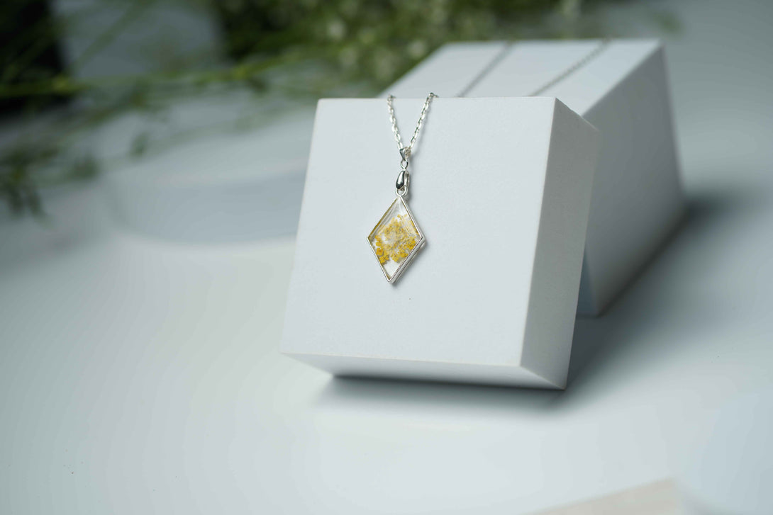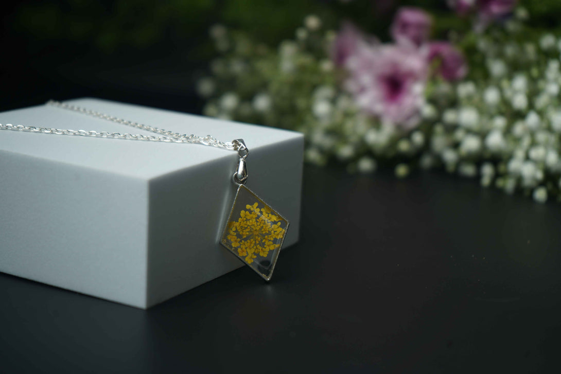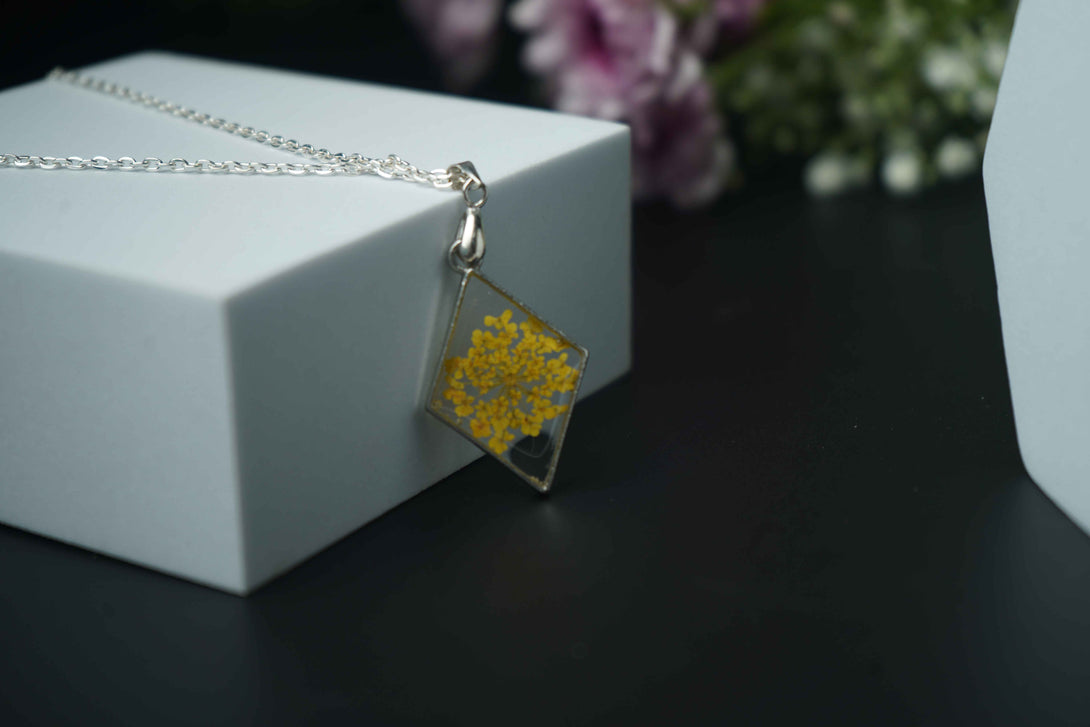 Showcase nature’s brilliance with our Yellow Real Annes Flower Pendant, elegantly set within a modern square frame.