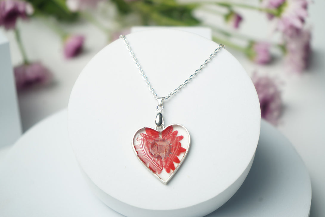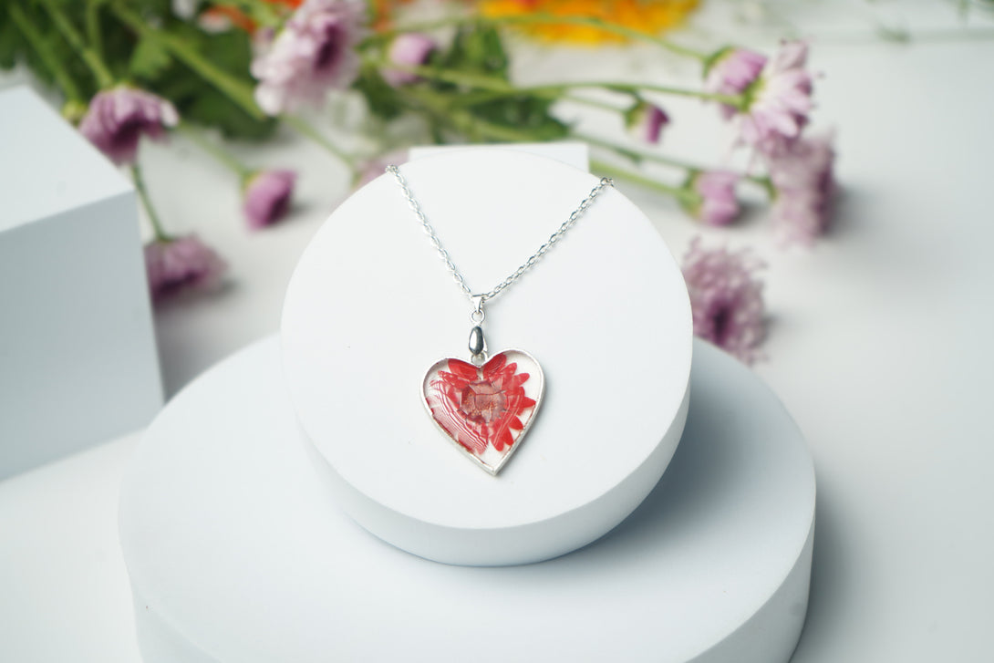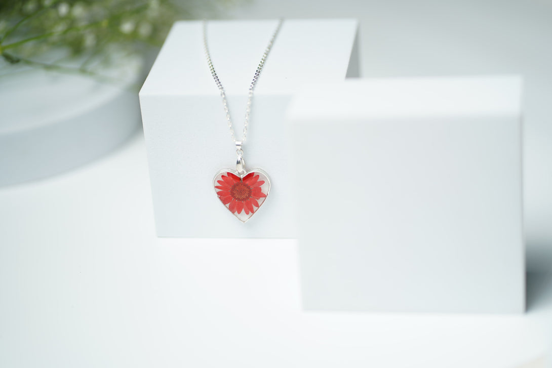 Embrace the beauty of nature and the essence of romance with this stunning Radiant Red Daisy Flower Pendant in a silver heart-shaped setting. Perfect for adding a vibrant touch to your ensemble or as a thoughtful gift for someone special.