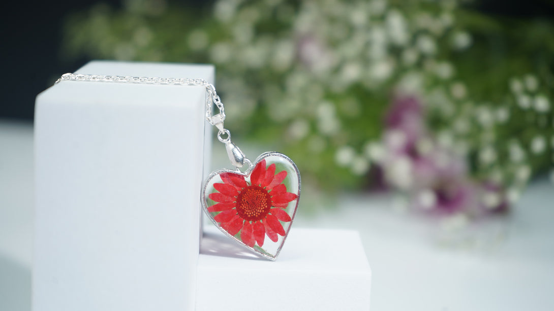 Brighten your jewelry collection with the vibrant charm of our Radiant Red Daisy Flower Pendant, beautifully encased in a classic silver heart-shaped frame. Key Points: Authentic Red Daisy Flower: Features a...