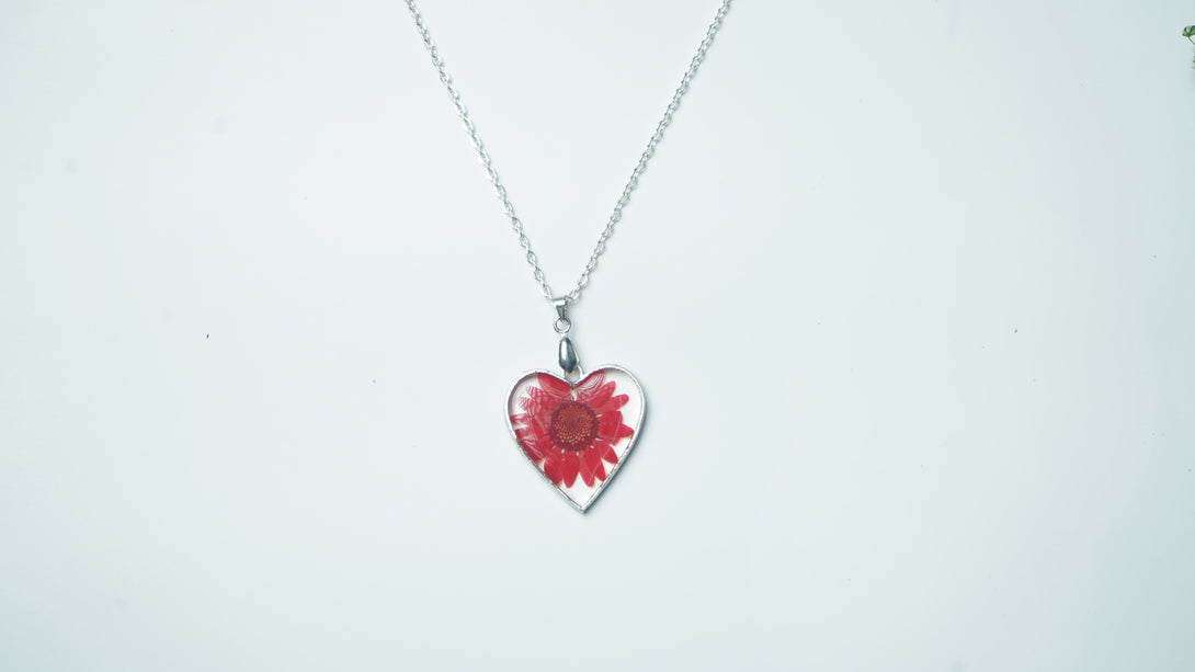 Brighten your jewelry collection with the vibrant charm of our Radiant Red Daisy Flower Pendant, beautifully encased in a classic silver heart-shaped frame.