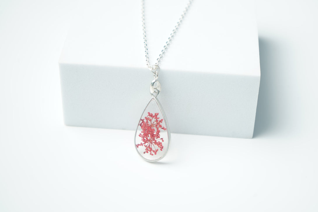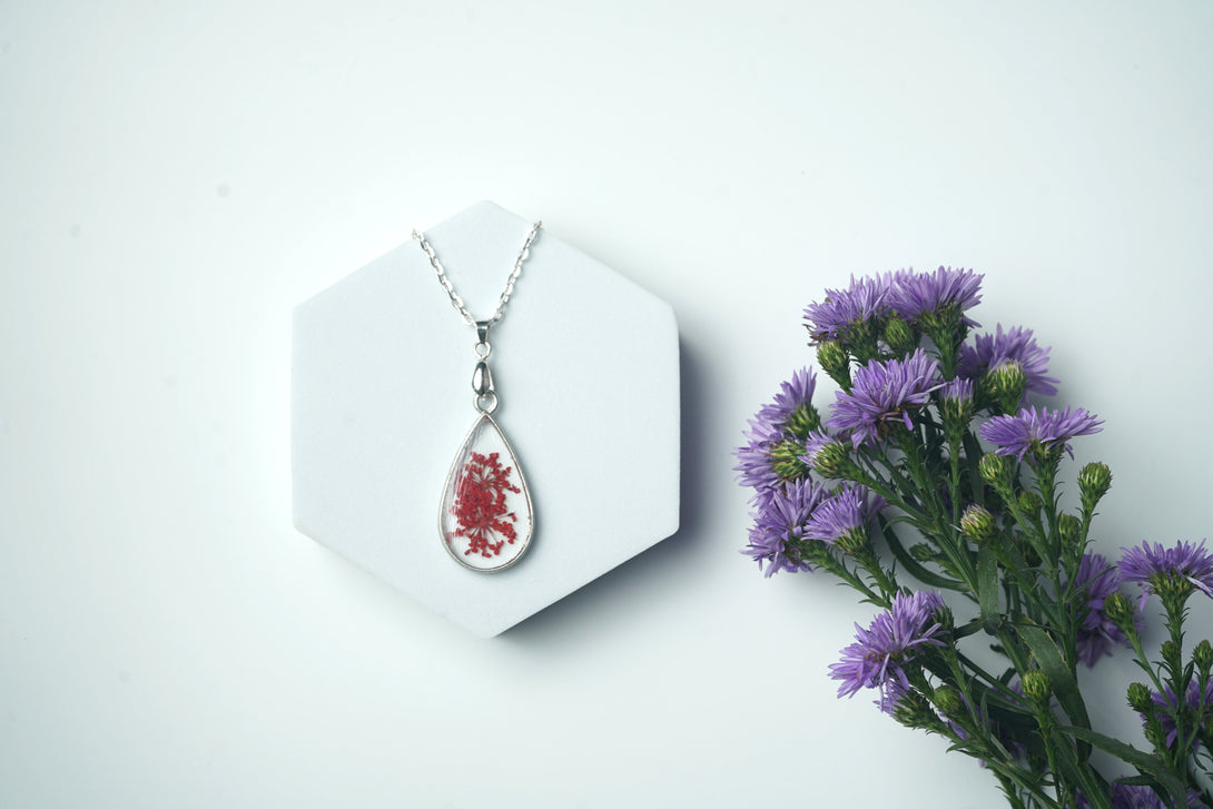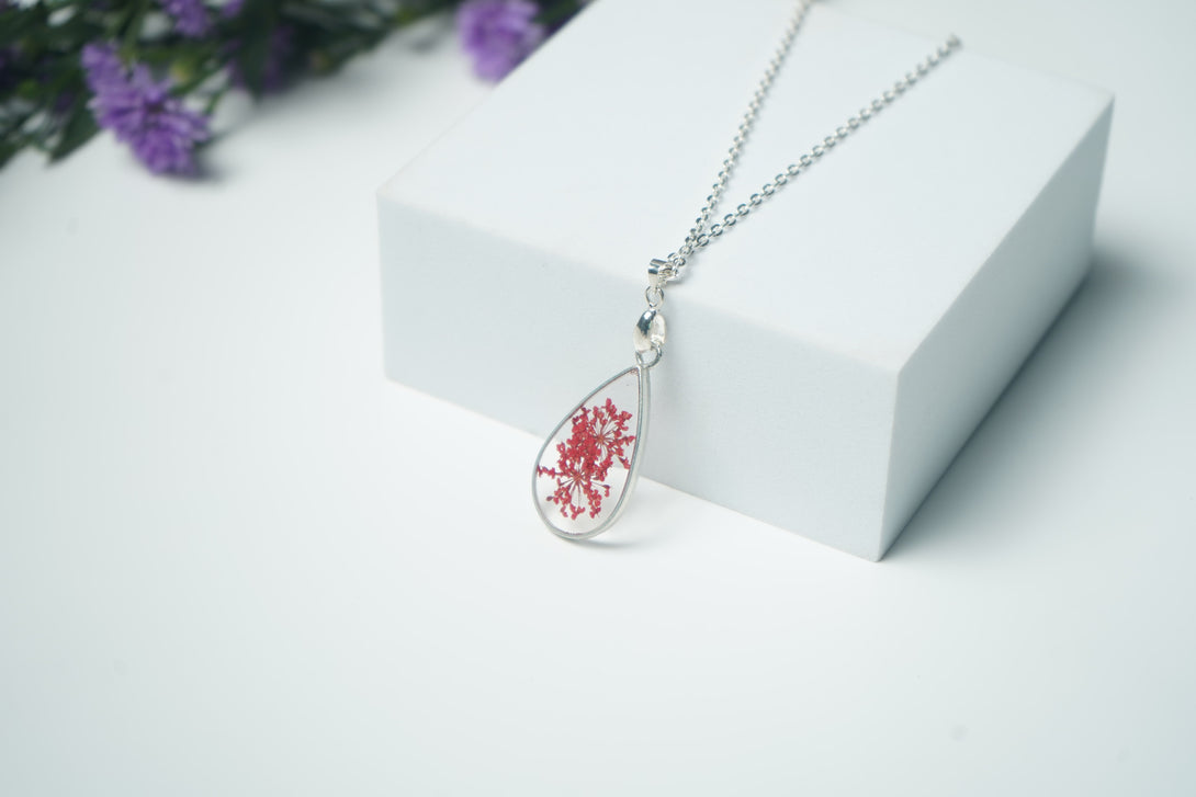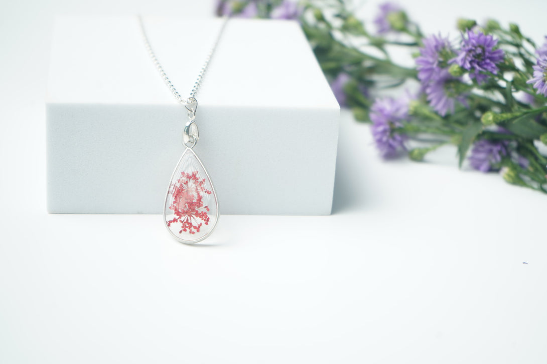 Embrace the timeless elegance of nature with our Real Maroon Annes Blossom in Silver Oval Pendant. This exquisite piece features genuine maroon Annes flowers, carefully preserved to maintain their rich, natural color and delicate beauty. The flowers are encased in a polished silver oval-shaped pendant, creating a classic and sophisticated accessory that exudes warmth and refinement.