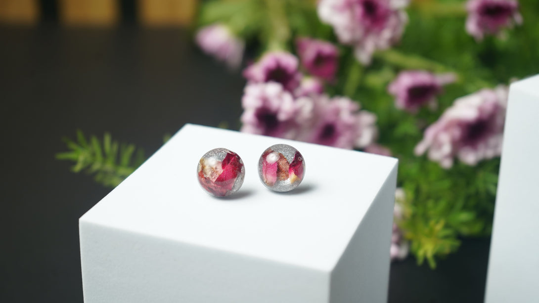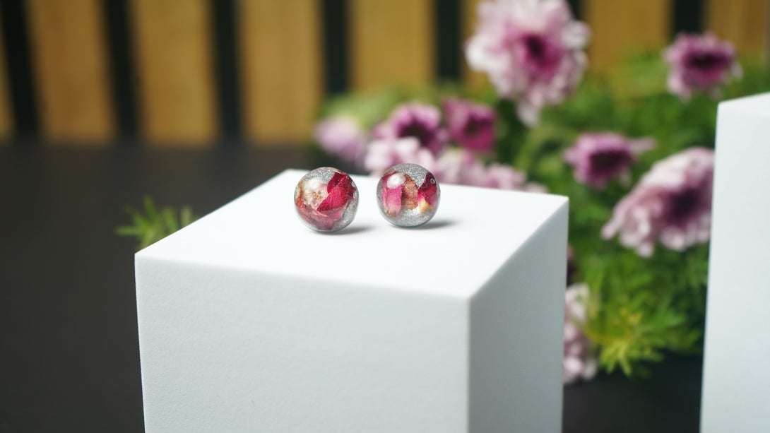 Immerse yourself in elegance with our handcrafted Elegant Real Rose Petal Resin Earrings. Each pair showcases meticulous craftsmanship, accentuated by shimmering silver details and adorned with delicate rose studs. These earrings epitomize sophistication and natural beauty, offering a perfect complement to any outfit.