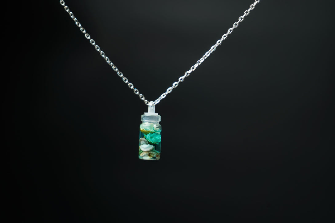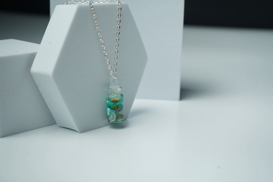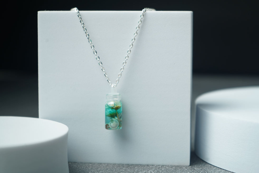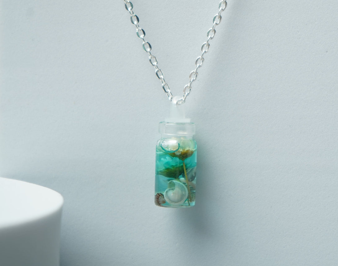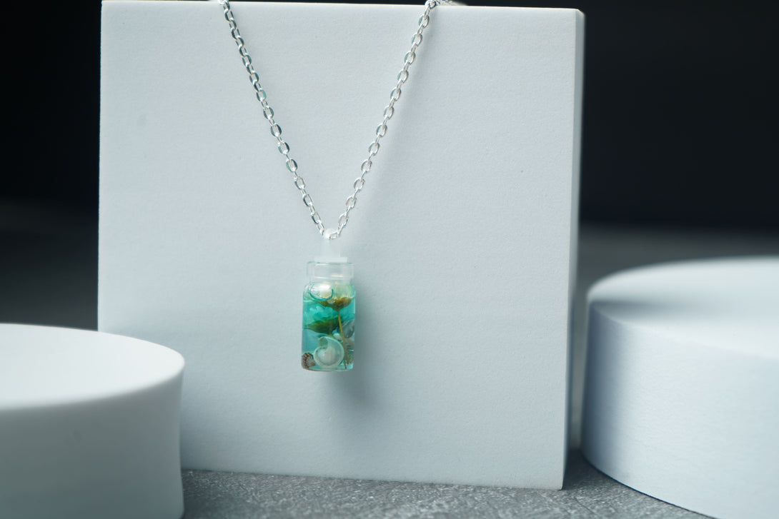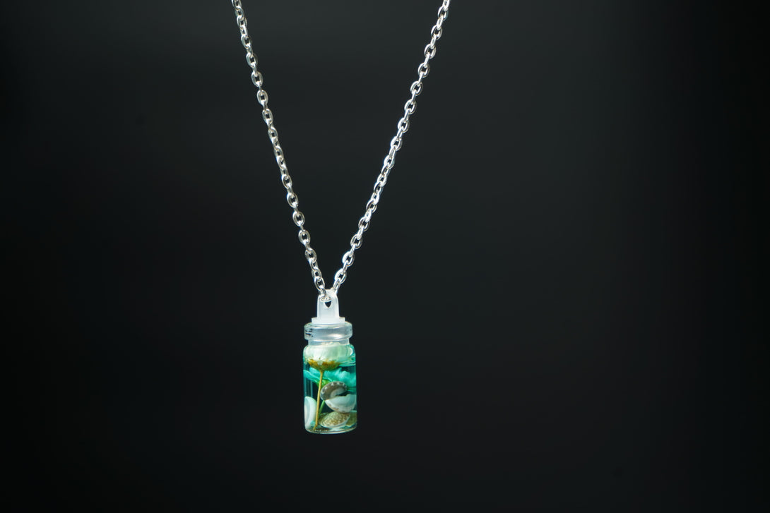 The small bottle pendant combines the serene allure of the seashell with the vivid charm of the flower, creating a unique and enchanting accessory. Ideal for adding a touch of coastal magic and floral beauty to any outfit, this pendant is perfect for both everyday wear and special occasions.