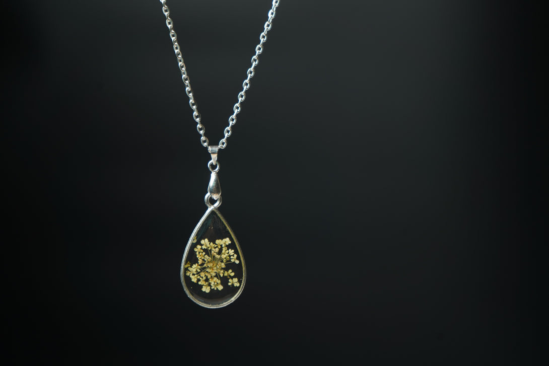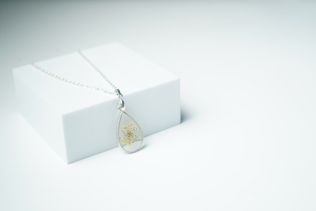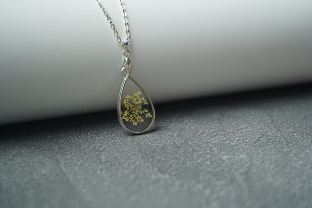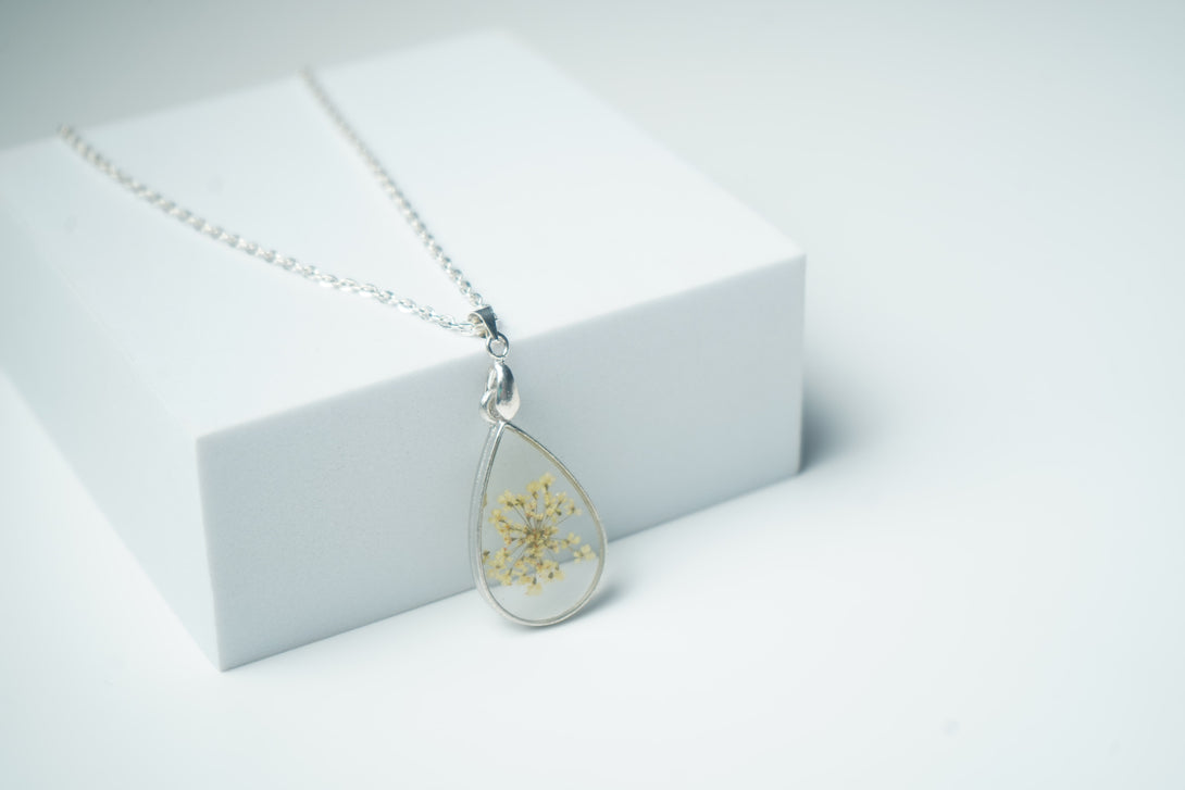 Elevate your jewelry collection with the refined elegance of our White Annes with Silver Drop-Shaped Pendant. This beautiful piece features delicate White Annes flowers, meticulously preserved to showcase their natural grace. The flowers are elegantly encased within a sleek, drop-shaped silver pendant, symbolizing purity and sophistication.
