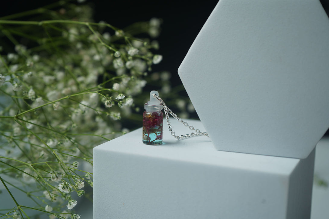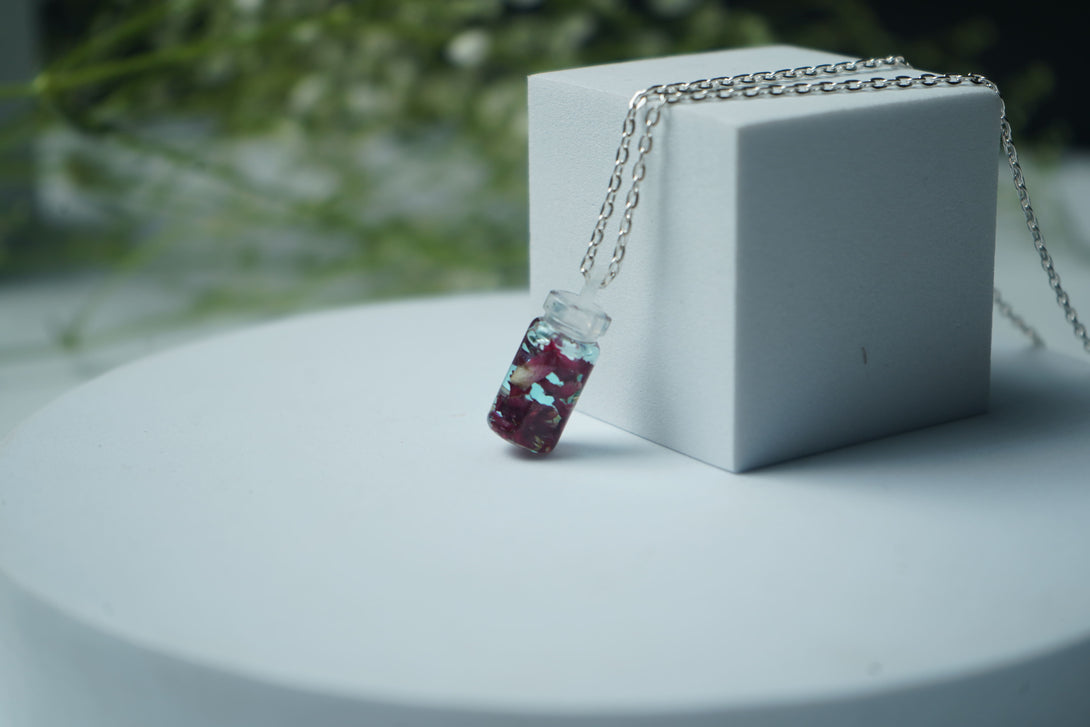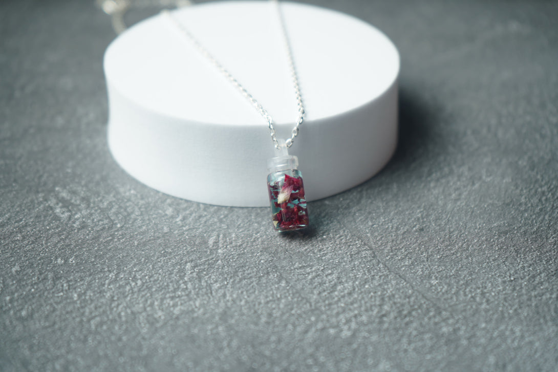 Tags: rose petal pendant, small bottle necklace, floral charm pendant, nature-inspired jewelry, preserved flower necklace, miniature glass pendant