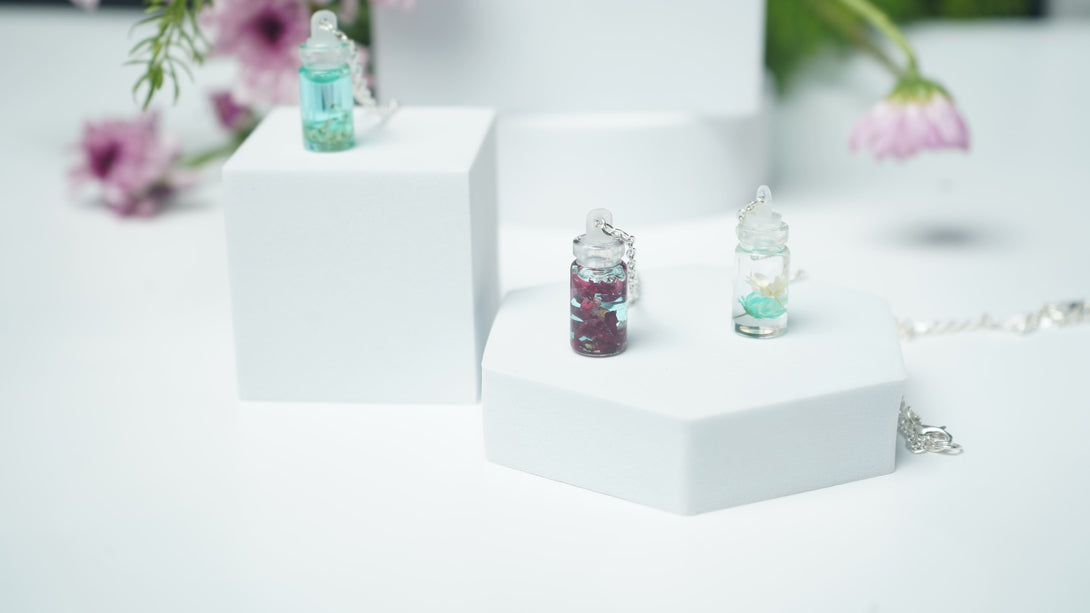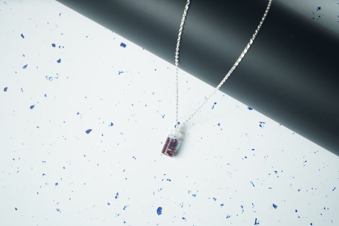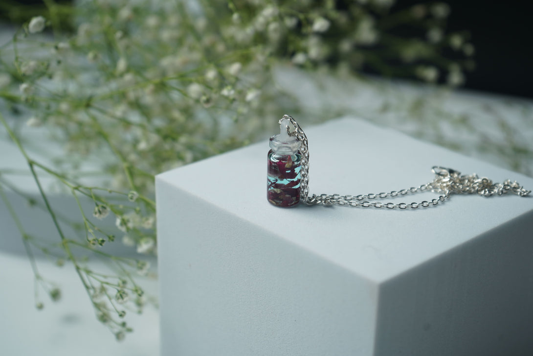 The small bottle pendant combines the charm of the preserved rose petal with the classic appeal of vintage-inspired glass. Perfect for adding a touch of nature and sophistication to any outfit, this pendant is ideal for both everyday wear and special occasions.
