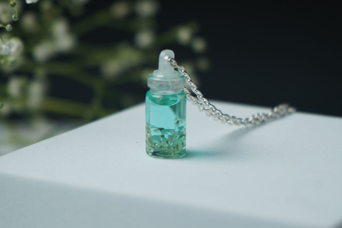Tags: white Annes lace pendant, real flower bottle necklace, miniature glass pendant, floral charm necklace, nature-inspired jewelry, delicate floral pendant