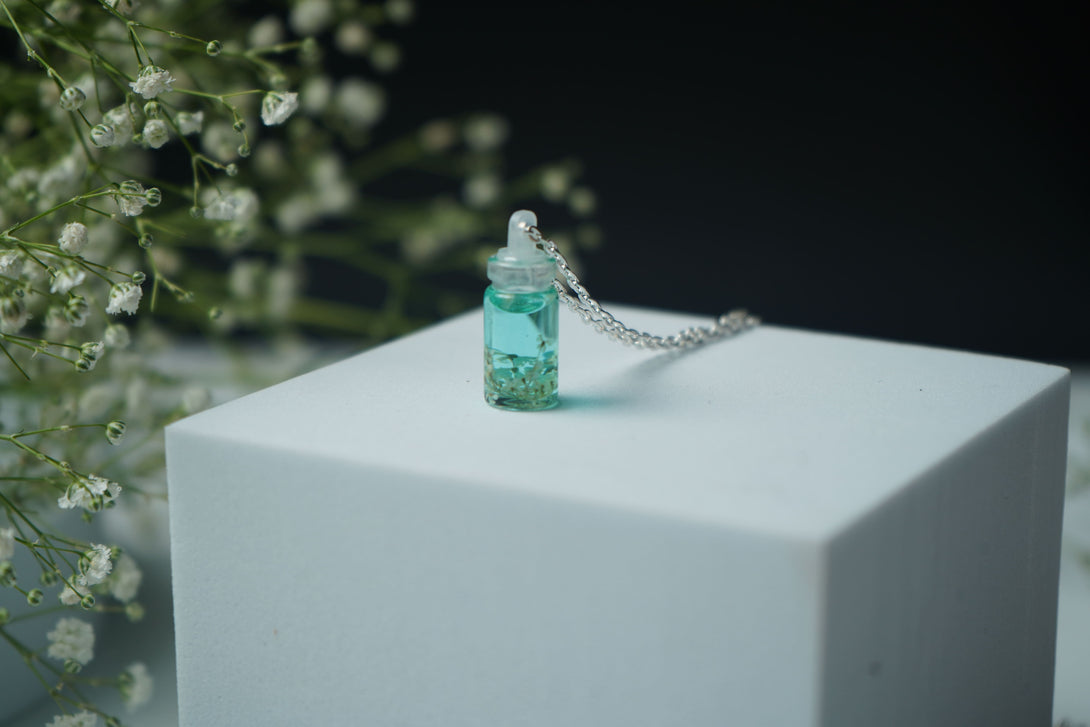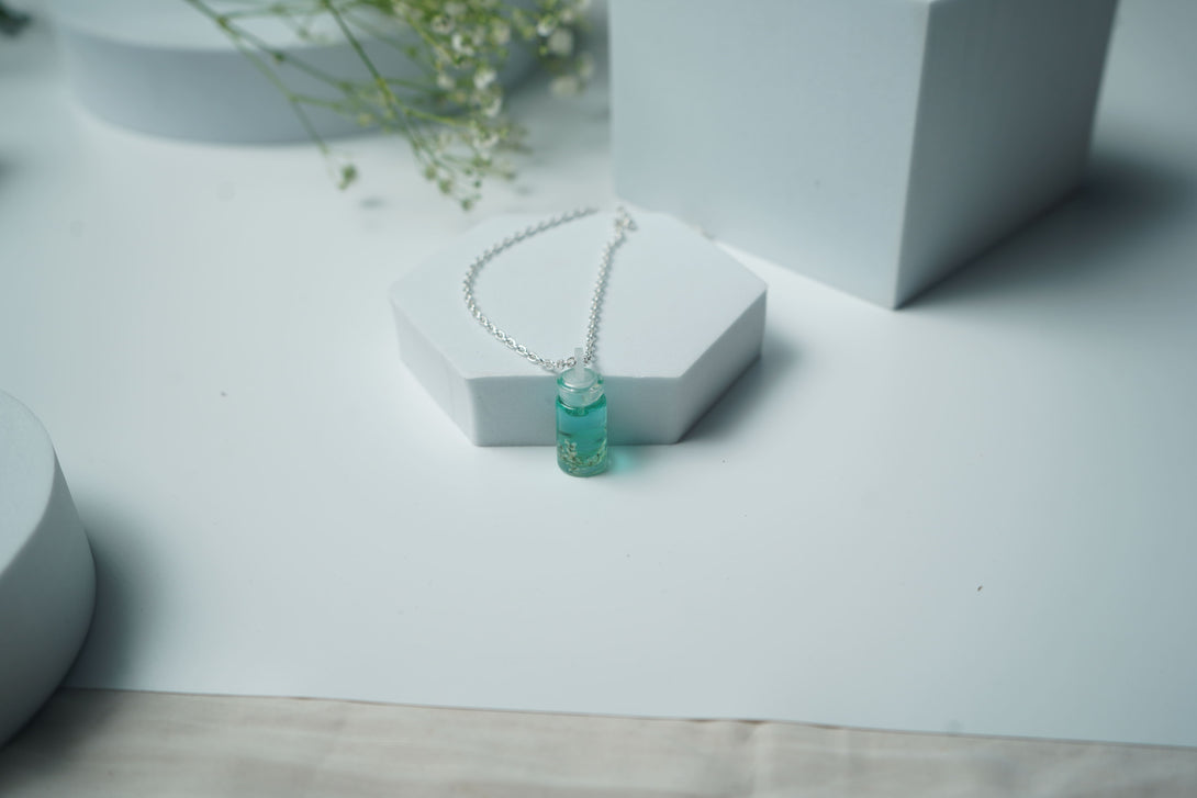 The small bottle pendant elegantly combines the beauty of the real flower with the classic charm of vintage-inspired glass. Perfect for adding a touch of refined floral grace and sophistication to any outfit, this pendant is versatile enough for both everyday wear and special occasions.