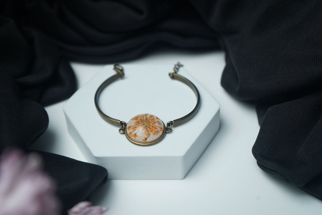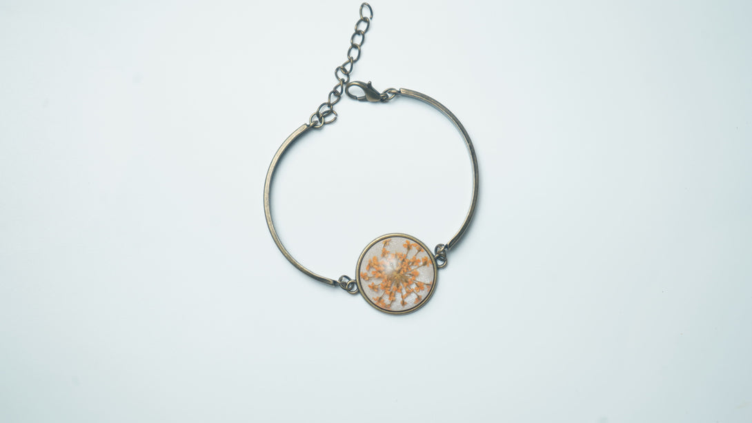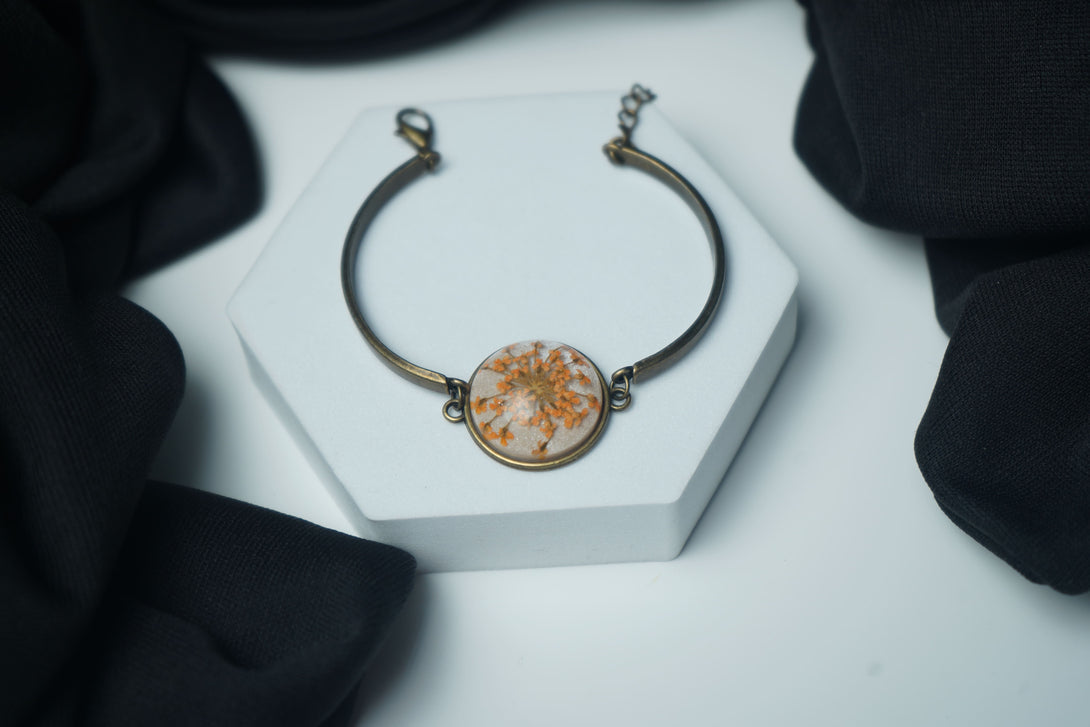 Infuse your style with a burst of vibrant color and intricate elegance with our Orange Annes Lace Flower Bracelet. This exquisite piece features delicate Annes lace, beautifully preserved in a rich orange hue. The lace's intricate floral design is encapsulated in a high-quality resin, ensuring its timeless beauty and durability.