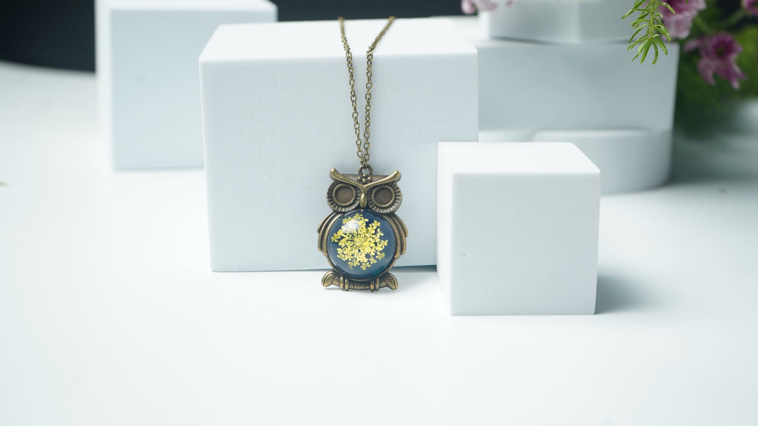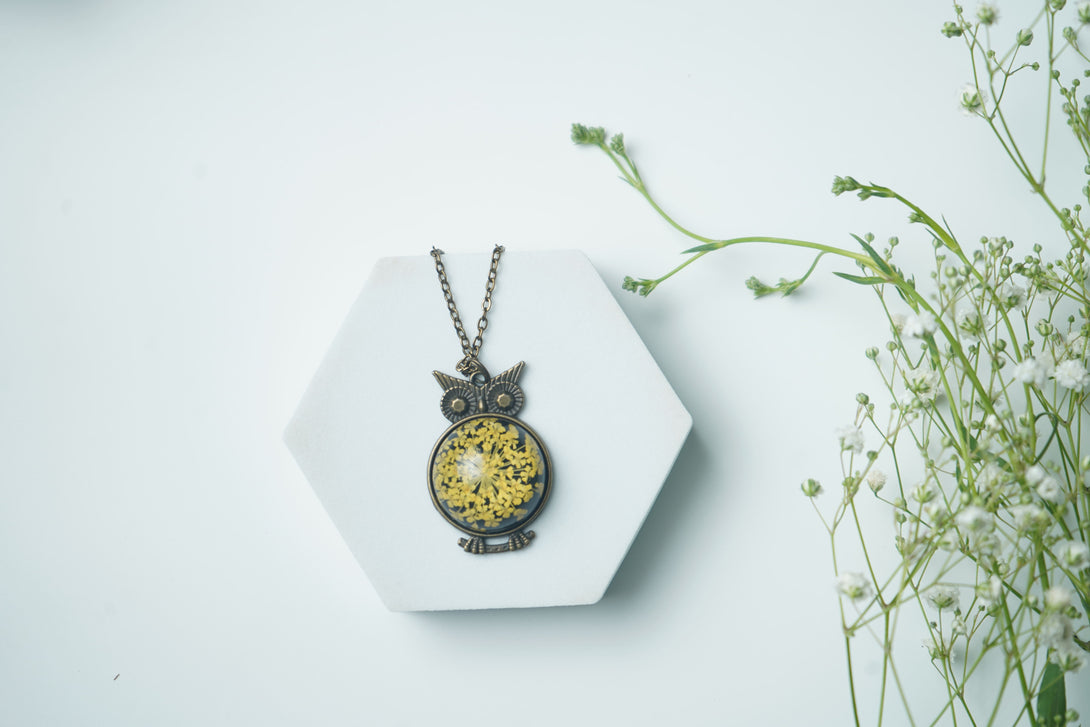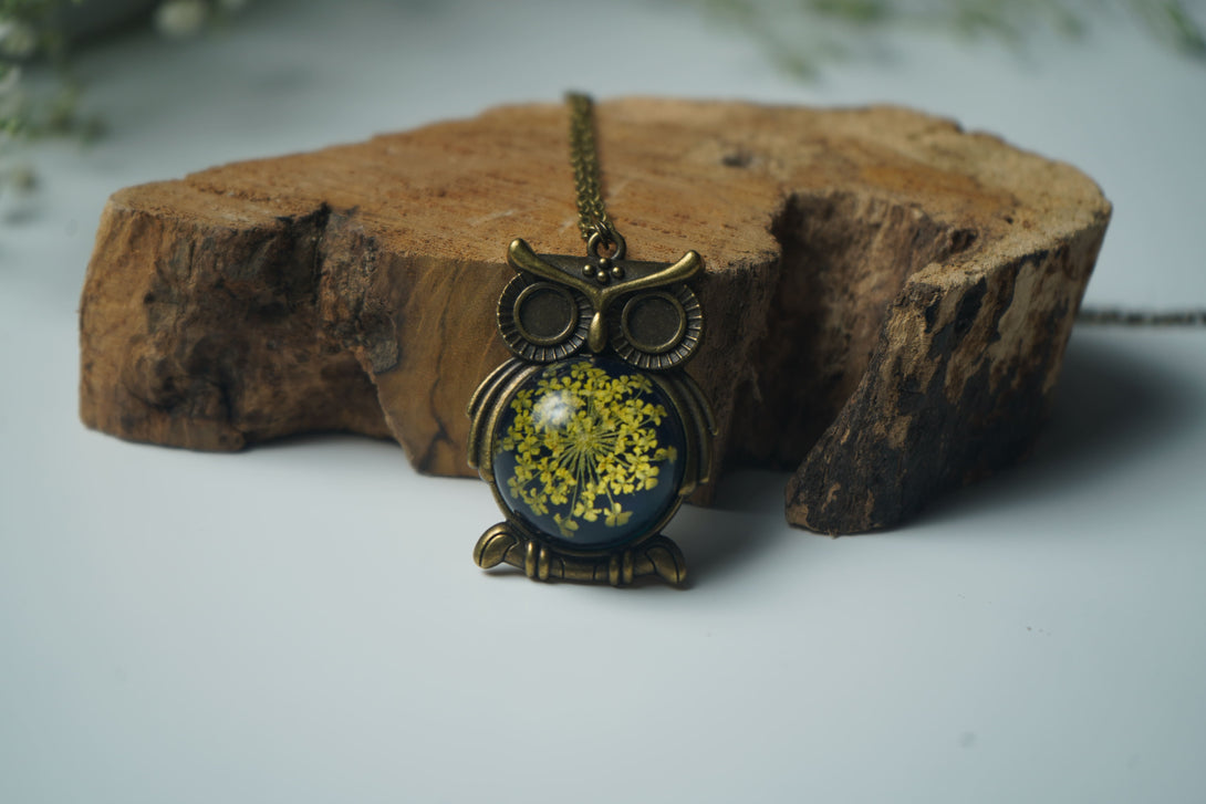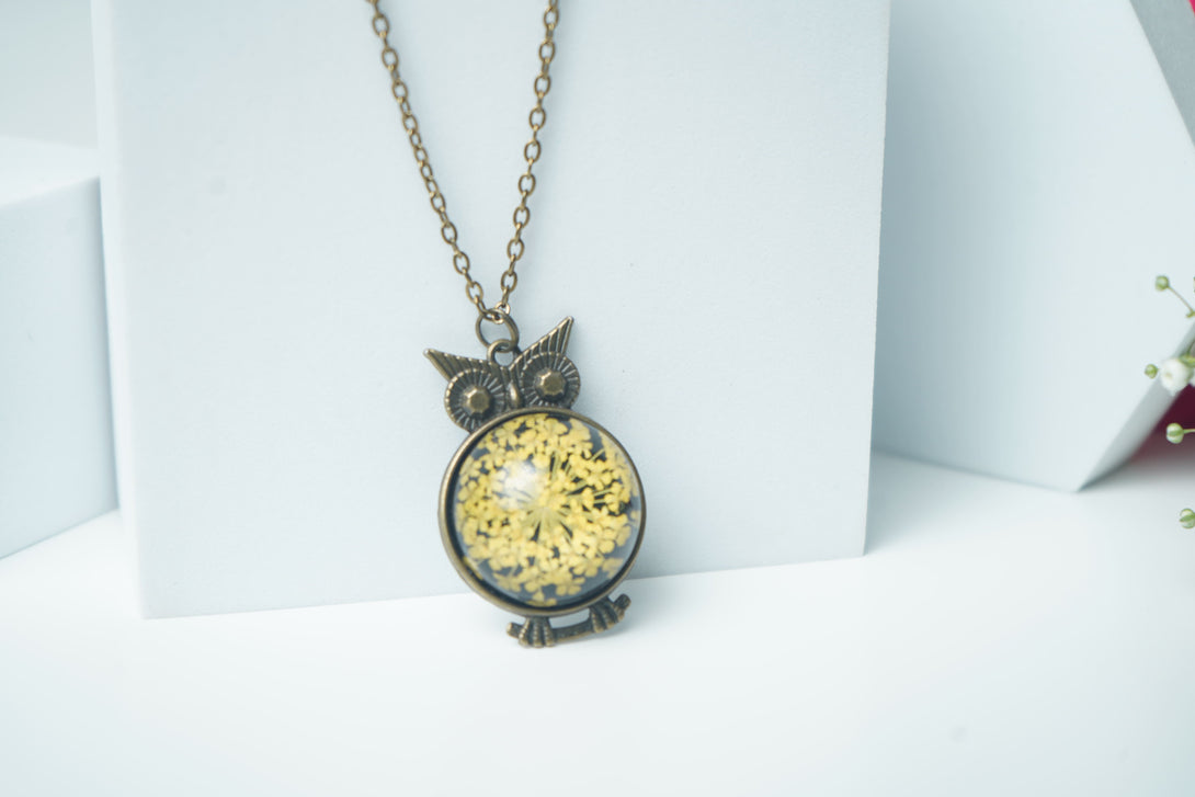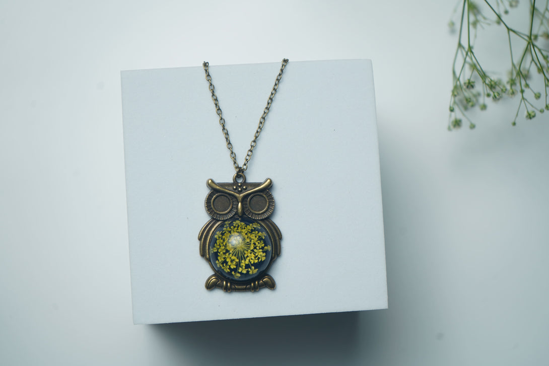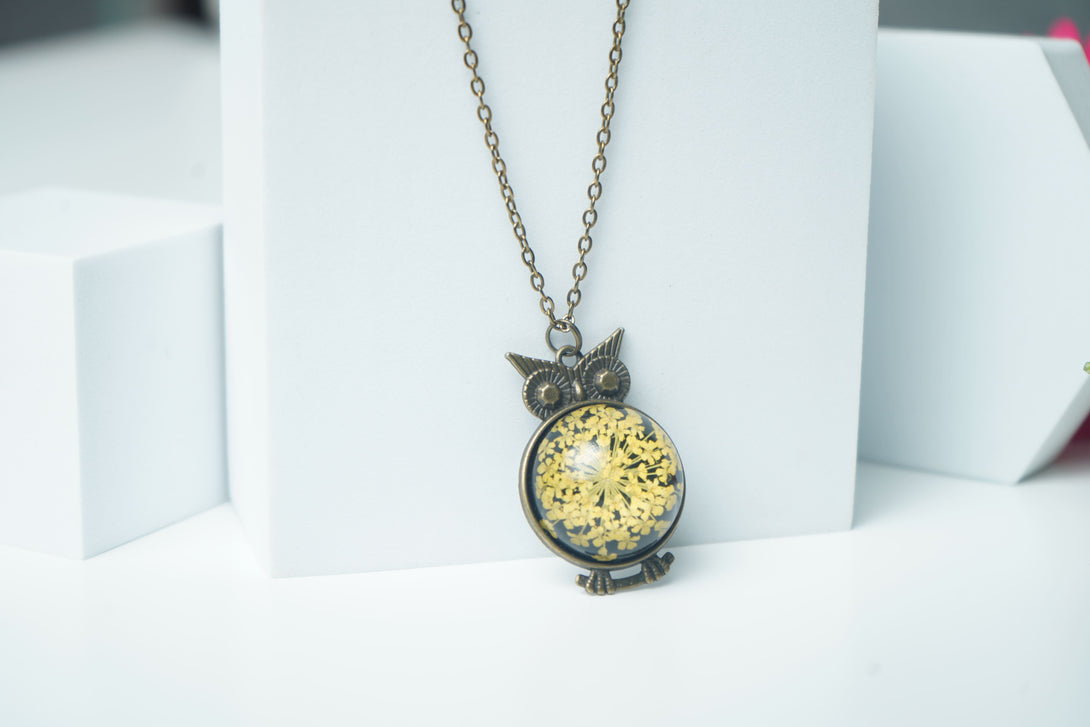 Tags: yellow Annes lace pendant, owl resin jewelry, whimsical flower pendant, real flower owl necklace, vintage-inspired owl pendant, unique floral jewelry