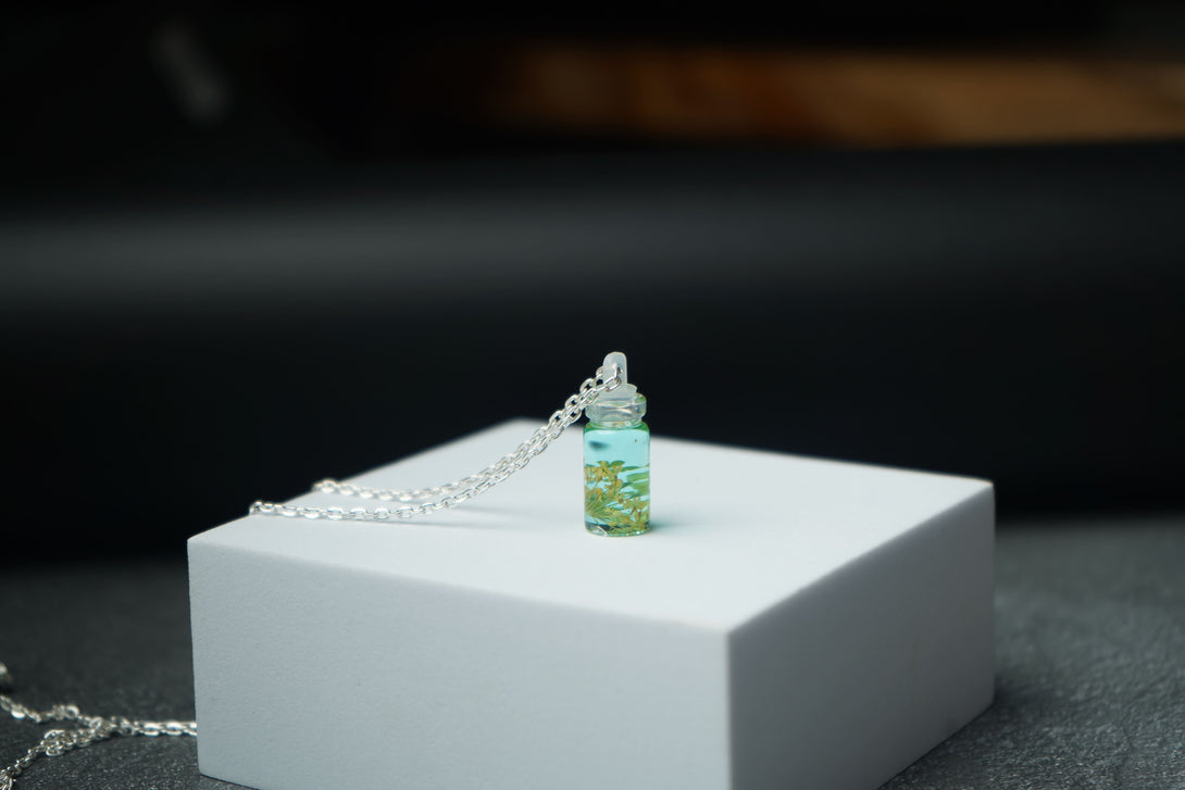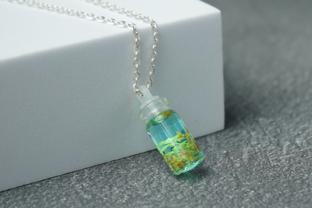 The small bottle pendant offers a unique way to carry a piece of nature with you, blending the elegance of the real flower with the timeless appeal of vintage-inspired glass. Perfect for adding a touch of floral grace and a splash of color to any outfit, this pendant is ideal for both everyday wear and special occasions.