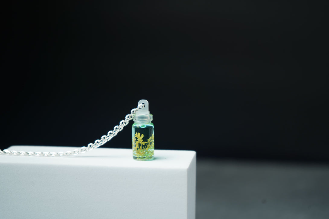 Embrace the delicate beauty of nature with our Yellow Annes Lace Real Flower in Small Bottle Pendant. This enchanting piece features a genuine yellow Annes lace flower, meticulously preserved within a tiny glass bottle. The vibrant yellow flower is beautifully showcased, capturing its intricate lace-like petals and sunny charm.