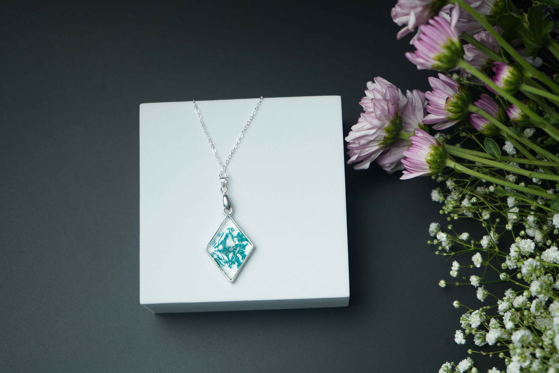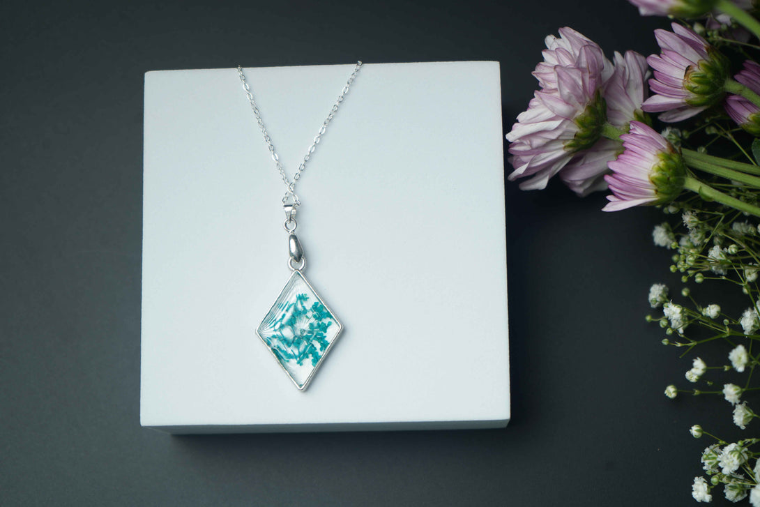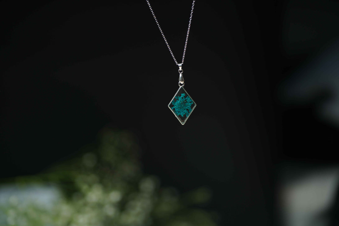 Capture the serene beauty of nature with our Light Blue Real Annes Flower Pendant, beautifully set within a modern square frame. Key Points: Authentic Annes Flower: Features a real light blue...