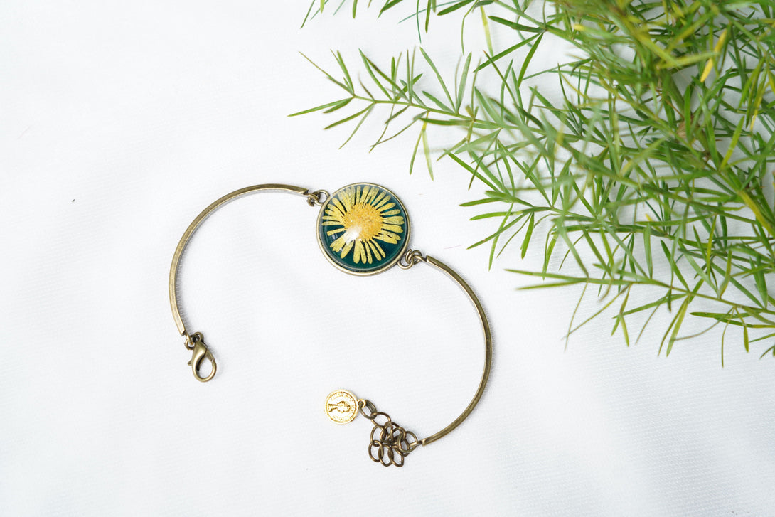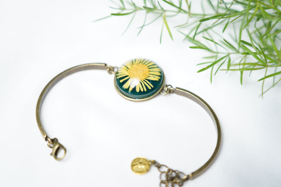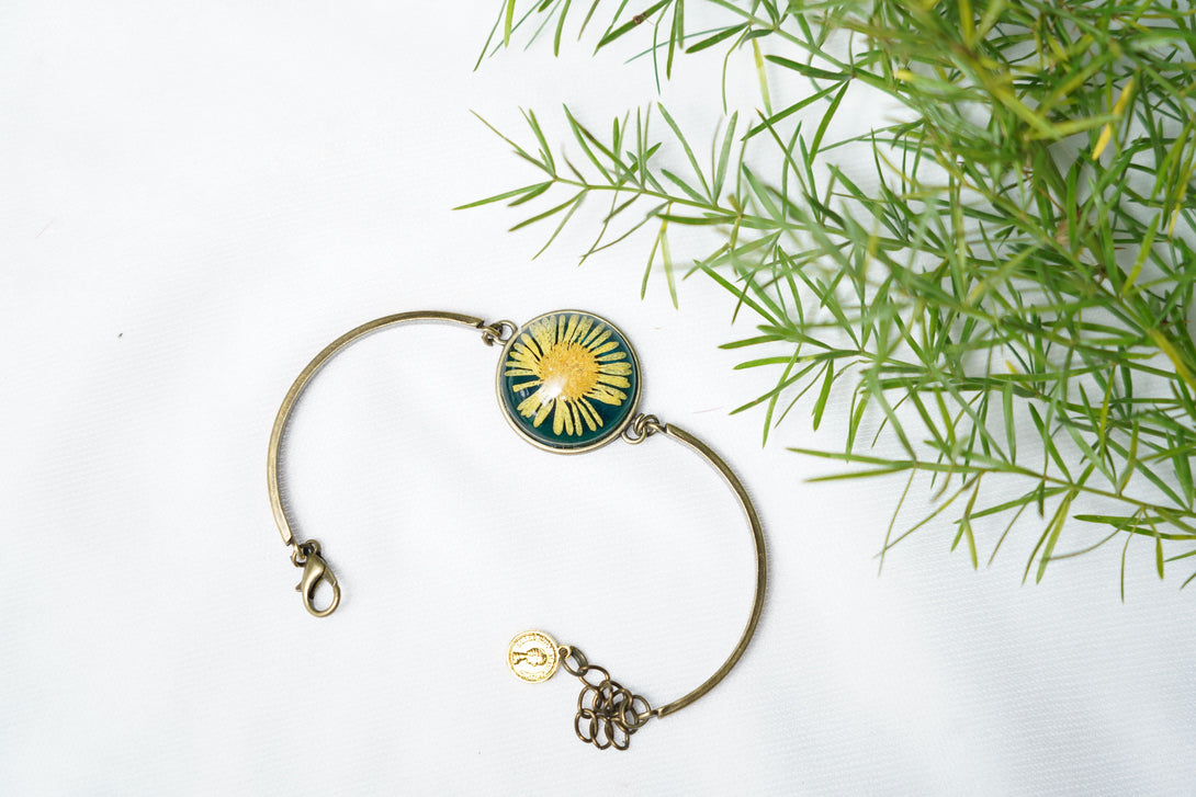 The Yellow Daizy flower with Blue shade bracelet is a stunning piece of handmade jewelry, featuring real flowers preserved in transparent resin. It showcases various flowers meticulously arranged and can come in different colors and sizes, with added embellishments for sparkle.